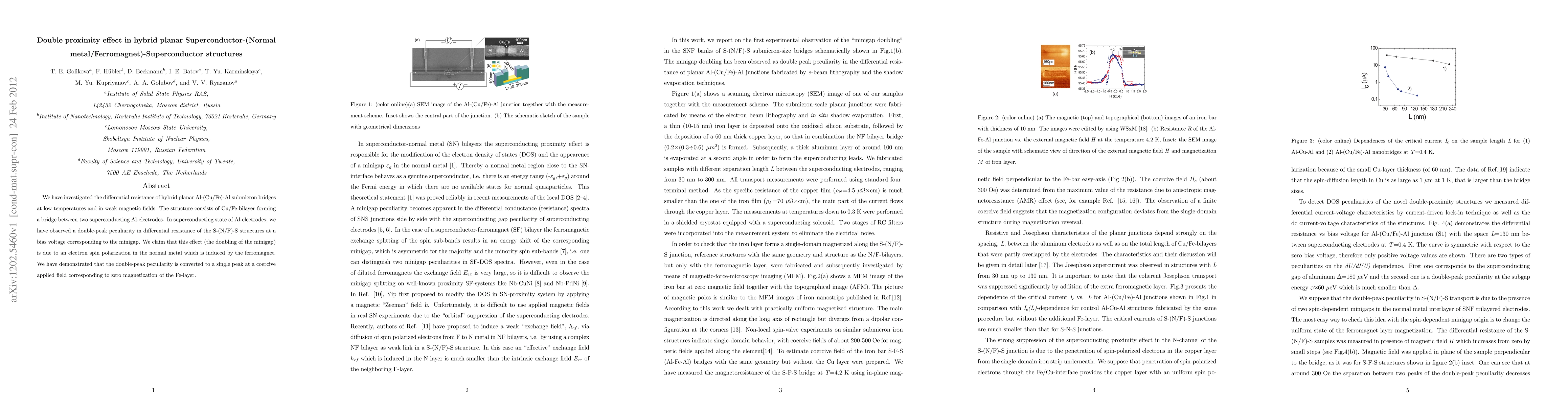 This study investigates the differential resistance of hybrid planar Al-(Cu/Fe)-Al structures, revealing a double-peak feature at the minigap in the superconducting state. The double-peak effect is attributed to electron spin polarization in the Cu layer induced by the Fe ferromagnet, which reverts to a single peak when the Fe layer's magnetization is zero.