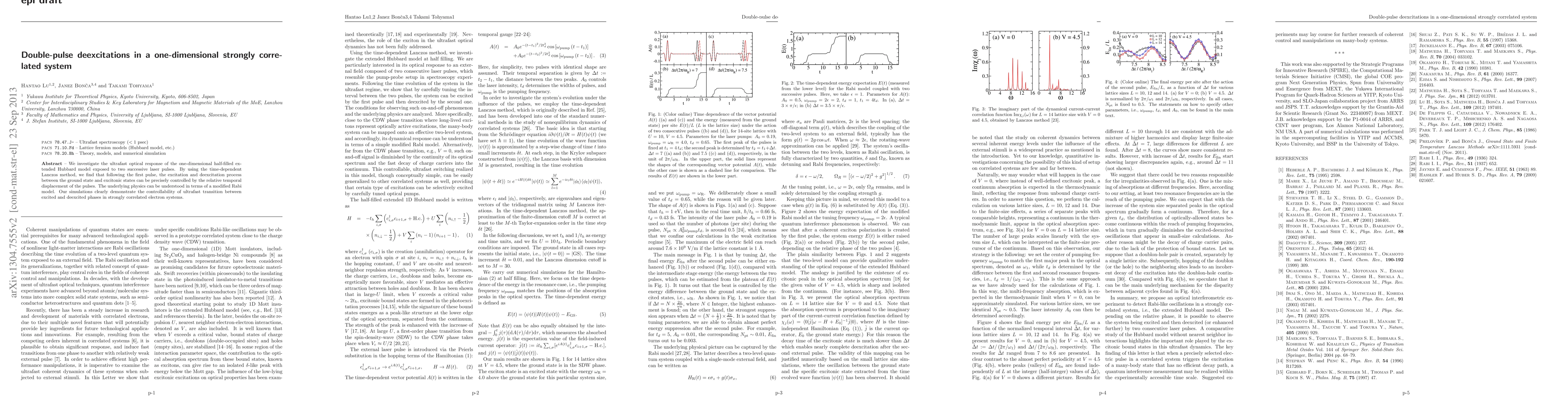 This study explores the ultrafast optical response of a one-dimensional half-filled extended Hubbard model to two successive laser pulses, revealing precise control over excitation and deexcitation processes via the pulses' temporal displacement. The findings are explained through a modified Rabi model, showcasing the manageability of transitions between excited and deexcited states in strongly correlated electron systems.