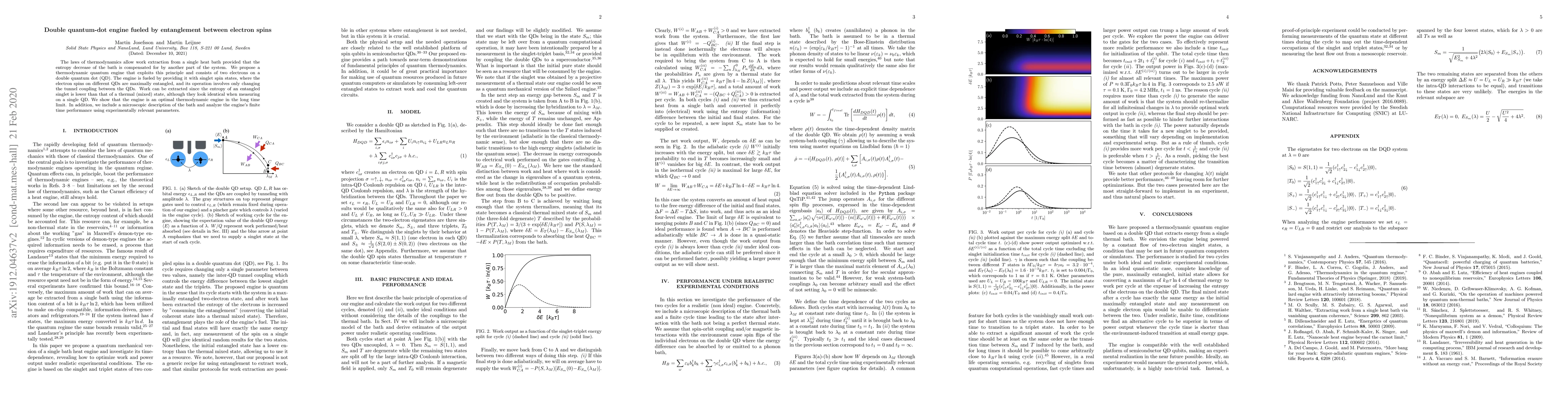 This paper proposes a quantum engine utilizing two entangled electrons on a double quantum dot, extracting work from their lower entropy entangled state compared to a thermal state. The engine optimally operates by adjusting tunnel coupling, demonstrating its efficiency in the long-time limit and analyzing finite-time performance with realistic parameters.