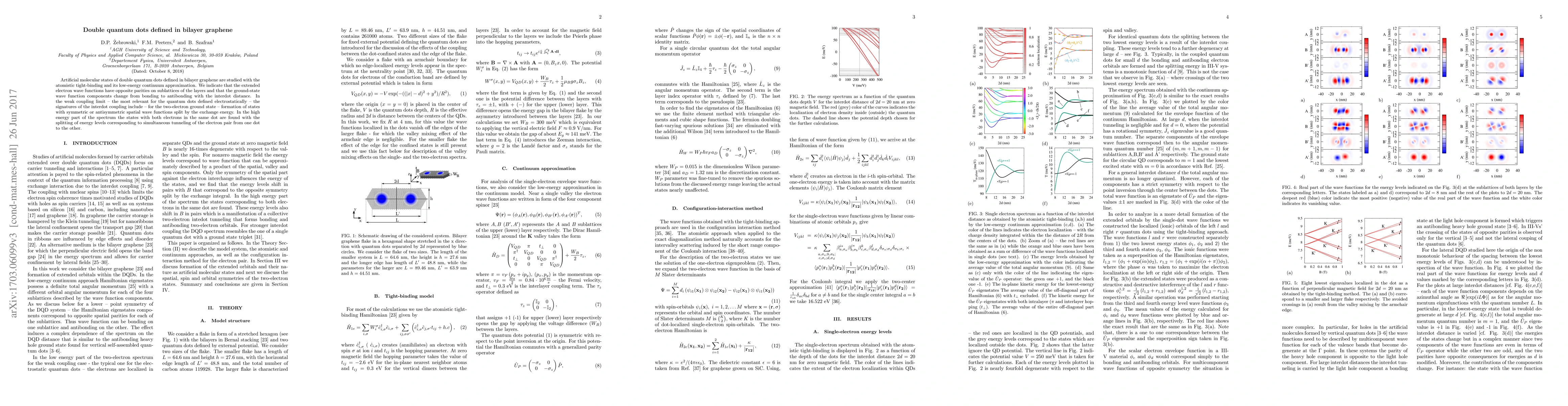 This study investigates double quantum dots in bilayer graphene using atomistic tight-binding models. It reveals that electron wave functions exhibit opposite parities across sublattices and transition from bonding to antibonding with interdot distance, with notable signatures of interdot coupling manifesting in symmetric or antisymmetric two-electron states and simultaneous electron tunneling.