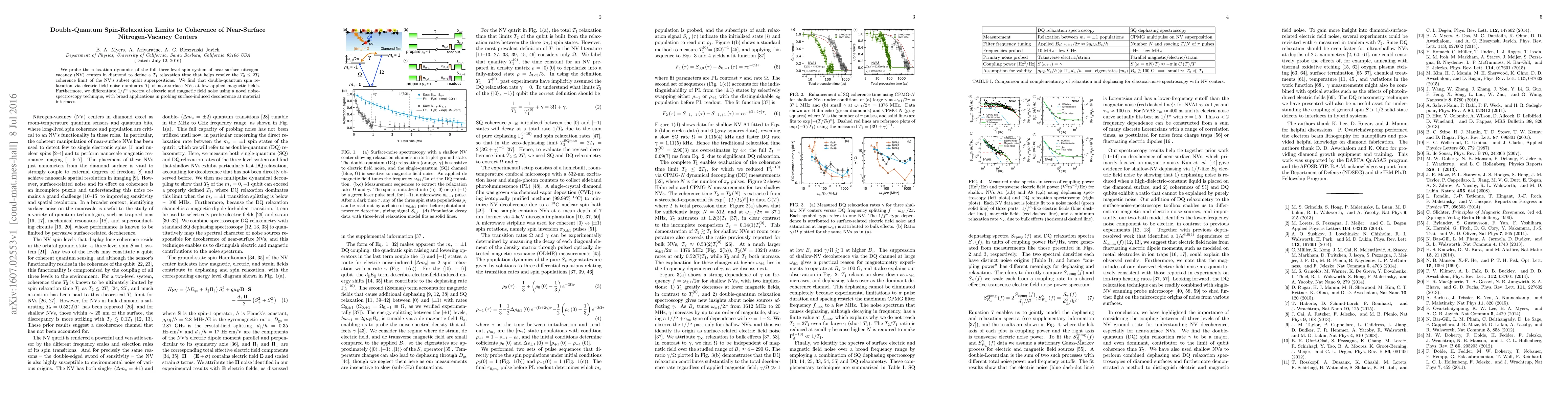 We probe the relaxation dynamics of the full three-level spin system of near-surface nitrogen-vacancy (NV) centers in diamond to define a $T_{1}$ relaxation time that helps resolve the $T_{2} \leq 2T_{1}$ coherence limit of the NV's subset qubit superpositions. We find that double-quantum spin relaxation via electric field noise dominates $T_{1}$ of near-surface NVs at low applied magnetic fields. Furthermore, we differentiate $1/f^{\alpha}$ spectra of electric and magnetic field noise using a novel noise-spectroscopy technique, with broad applications in probing surface-induced decoherence at material interfaces.