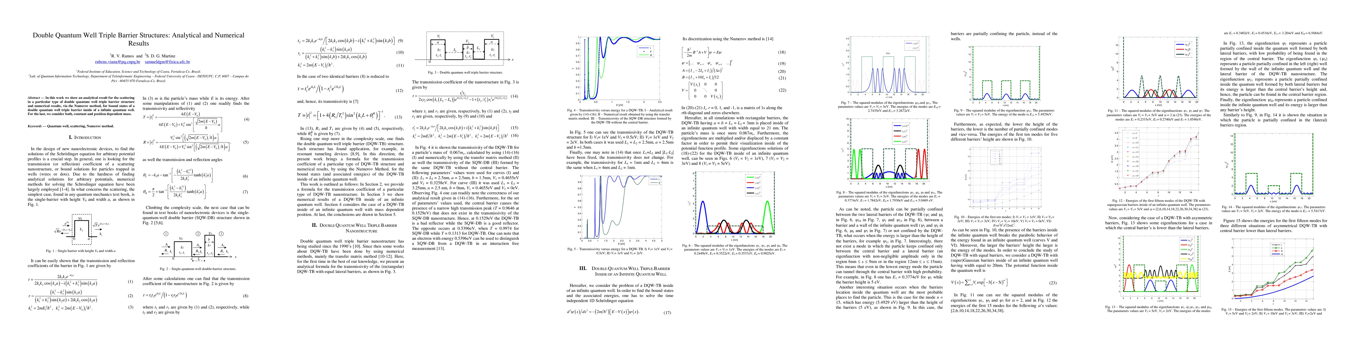 In this work we show an analytical result for the scattering in a particular type of double quantum well triple barrier structure and numerical results, via the Numerov method, for bound states of a double quantum well triple barrier inside of a infinite quantum well. For the last, we consider both, constant and position dependent mass.