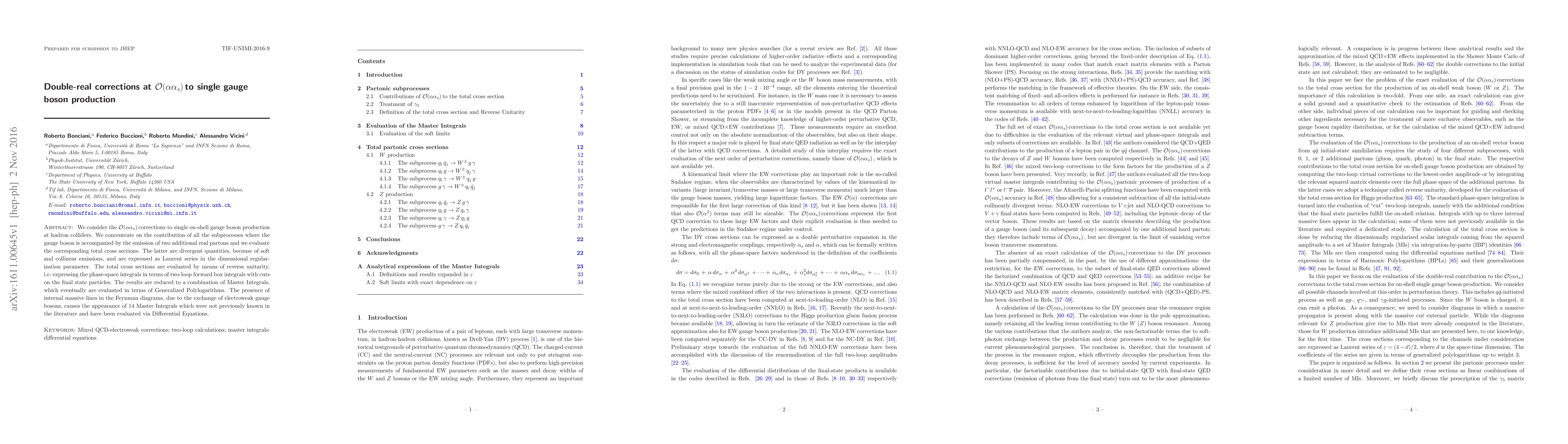 We consider the O(alpha alpha_s) corrections to single on-shell gauge boson production at hadron colliders. We concentrate on the contribution of all the subprocesses where the gauge boson is accompanied by the emission of two additional real partons and we evaluate the corresponding total cross sections. The latter are divergent quantities, because of soft and collinear emissions, and are expressed as Laurent series in the dimensional regularization parameter. The total cross sections are evaluated by means of reverse unitarity, i.e. expressing the phase-space integrals in terms of two-loop forward box integrals with cuts on the final state particles. The results are reduced to a combination of Master Integrals, which eventually are evaluated in terms of Generalized Polylogarithms. The presence of internal massive lines in the Feynman diagrams, due to the exchange of electroweak gauge bosons, causes the appearance of 14 Master Integrals which were not previously known in the literature and have been evaluated via Differential Equations.