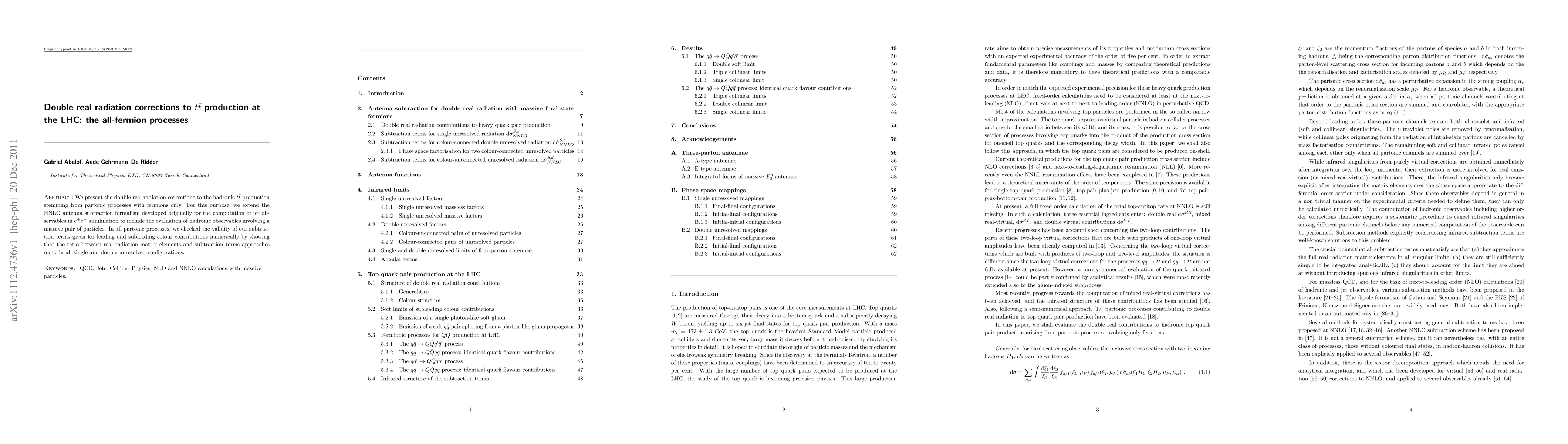 This paper presents the double real radiation corrections for $t\bar{t}$ production at the LHC through all-fermion partonic processes, utilizing an extended NNLO antenna subtraction formalism. The authors verify the validity of their subtraction terms by demonstrating that the ratio between real radiation matrix elements and subtraction terms approaches unity in various configurations.