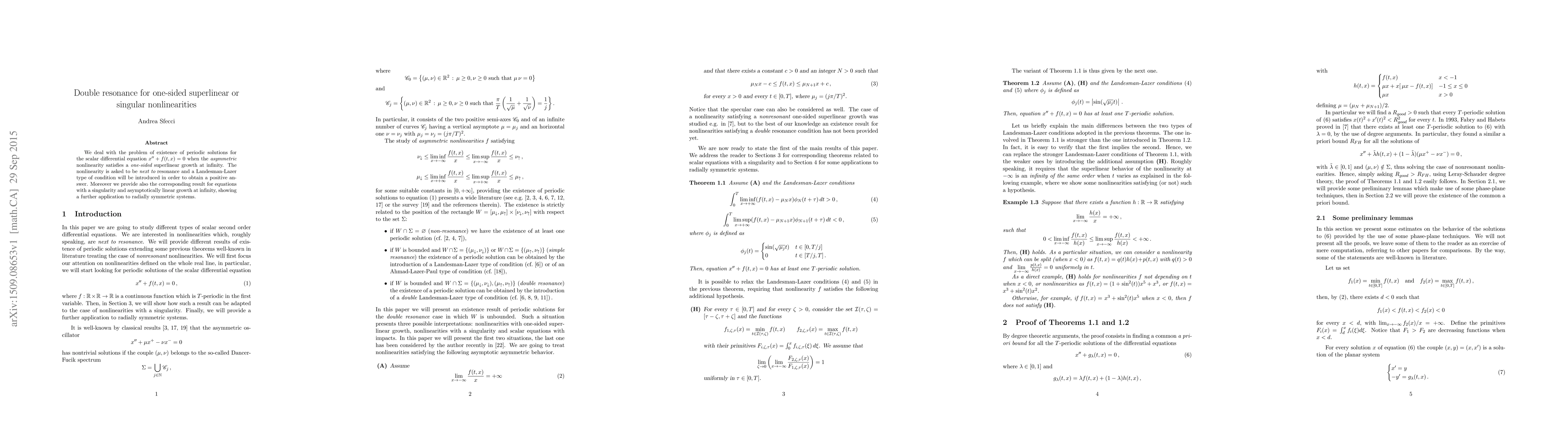 We deal with the problem of existence of periodic solutions for the scalar differential equation x" + f (t, x) = 0 when the asymmetric nonlinearity satisfies a one-sided superlinear growth at infinity. The nonlinearity is asked to be next to resonance and a Landesman-Lazer type of condition will be introduced in order to obtain a positive answer. Moreover we provide also the corresponding result for equations with a singularity and asymptotically linear growth at infinity, showing a further application to radially symmetric systems.