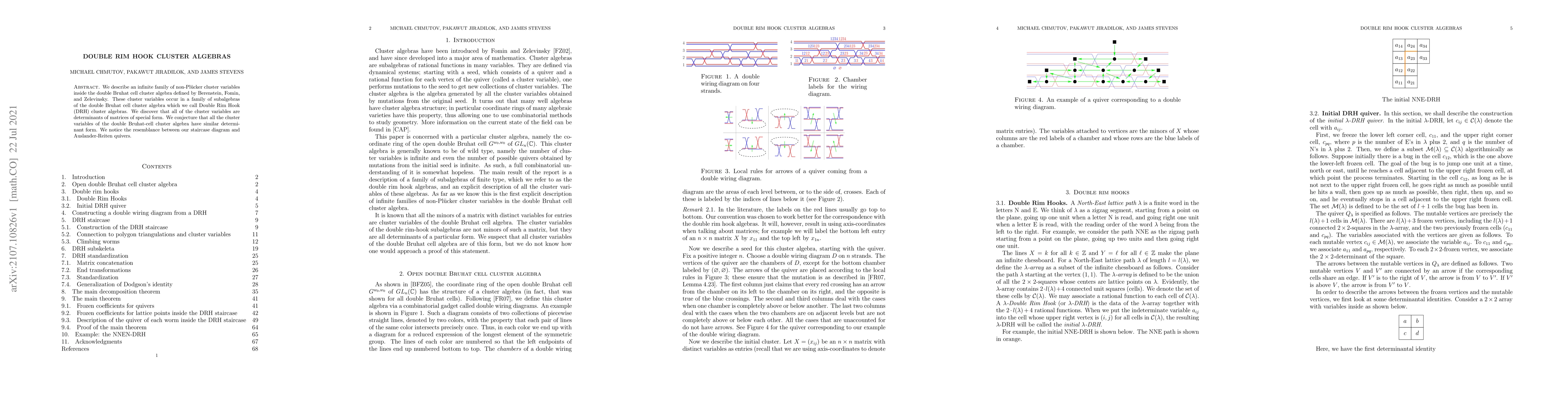 This paper introduces Double Rim Hook (DRH) cluster algebras, an infinite family of non-Plücker cluster variables within the double Bruhat cell cluster algebra, showing that these variables are determinants of specially structured matrices. The authors conjecture that all cluster variables in this algebra share a similar determinant form.