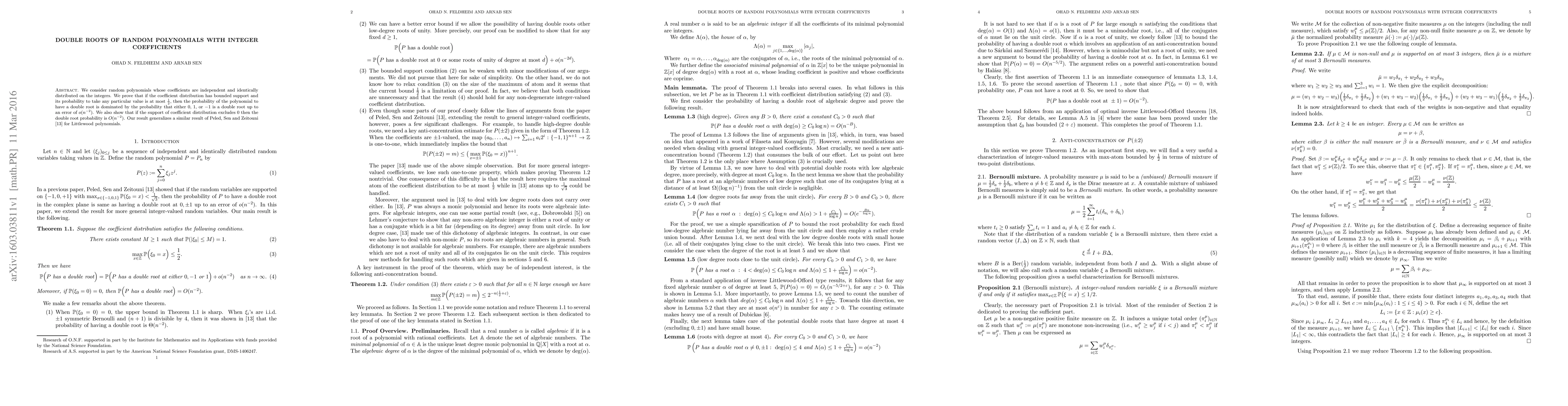 This paper proves that random polynomials with integer coefficients, having bounded support and limited probabilities, exhibit double roots primarily due to roots at $0$, $1$, or $-1$, with a small error term. It further generalizes that excluding $0$ from the coefficient support results in double roots occurring with a probability of $O(n^{-2})$.