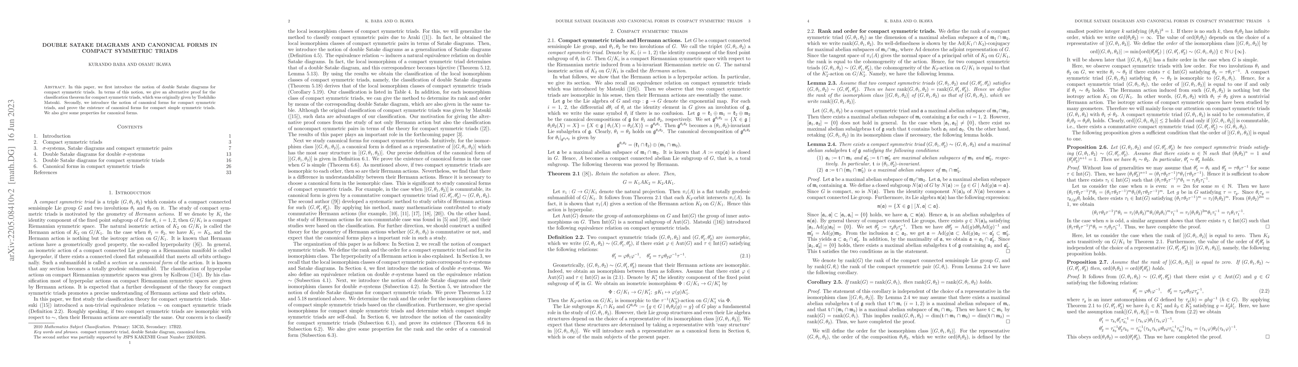 The paper introduces double Satake diagrams for compact symmetric triads, providing an alternative proof for the classification theorem originally given by Toshihiko Matsuki. It also defines canonical forms for compact symmetric triads, proving their existence for compact simple symmetric triads and outlining their properties.