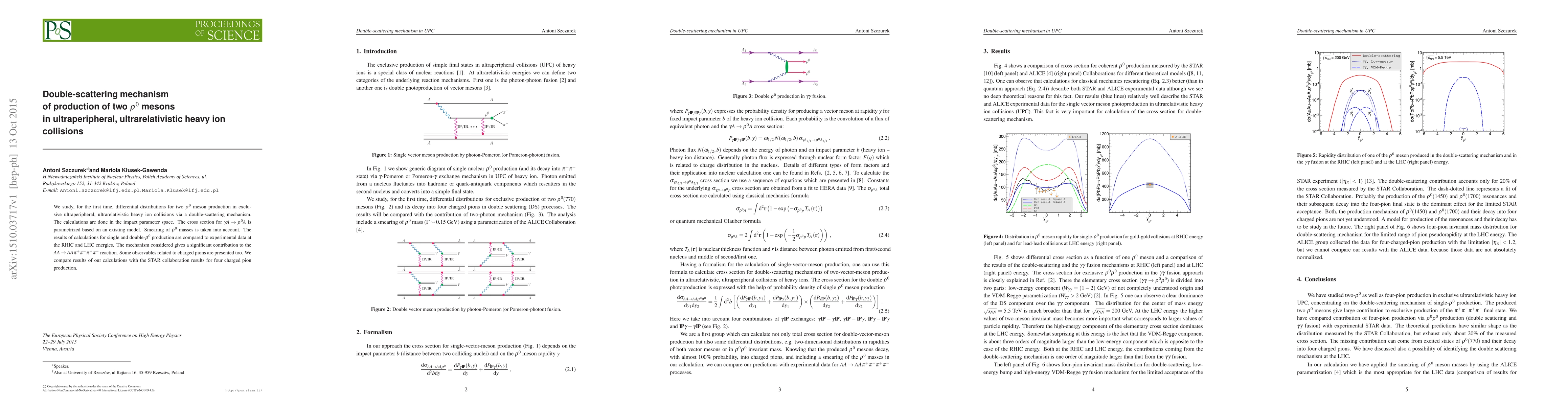 We study, for the first time, differential distributions for two $\rho^0$ meson production in exclusive ultraperipheral, ultrarelativistic heavy ion collisions via a double-scattering mechanism. The calculations are done in the impact parameter space. The cross section for $\gamma A \to \rho^0 A$ is parametrized based on an existing model. Smearing of $\rho^0$ masses is taken into account. The results of calculations for single and double-$\rho^0$ production are compared to experimental data at the RHIC and LHC energies. The mechanism considered gives a significant contribution to the $AA \to AA \pi^+\pi^-\pi^+\pi^-$ reaction. Some observables related to charged pions are presented too. We compare results of our calculations with the STAR collaboration results for four charged pion production.