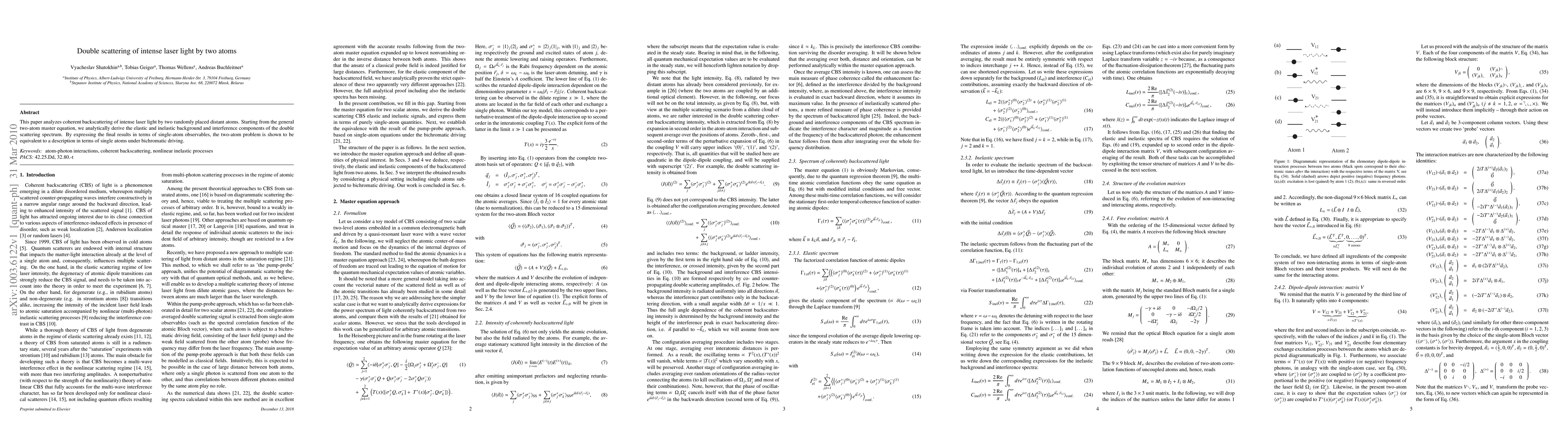 This paper analyzes coherent backscattering of intense laser light by two randomly placed distant atoms. Starting from the general two-atom master equation, we analytically derive the elastic and inelastic background and interference components of the double scattering spectrum. By expressing the final results in terms of single-atom observables, the two-atom problem is shown to be equivalent to a description in terms of single atoms under bichromatic driving.