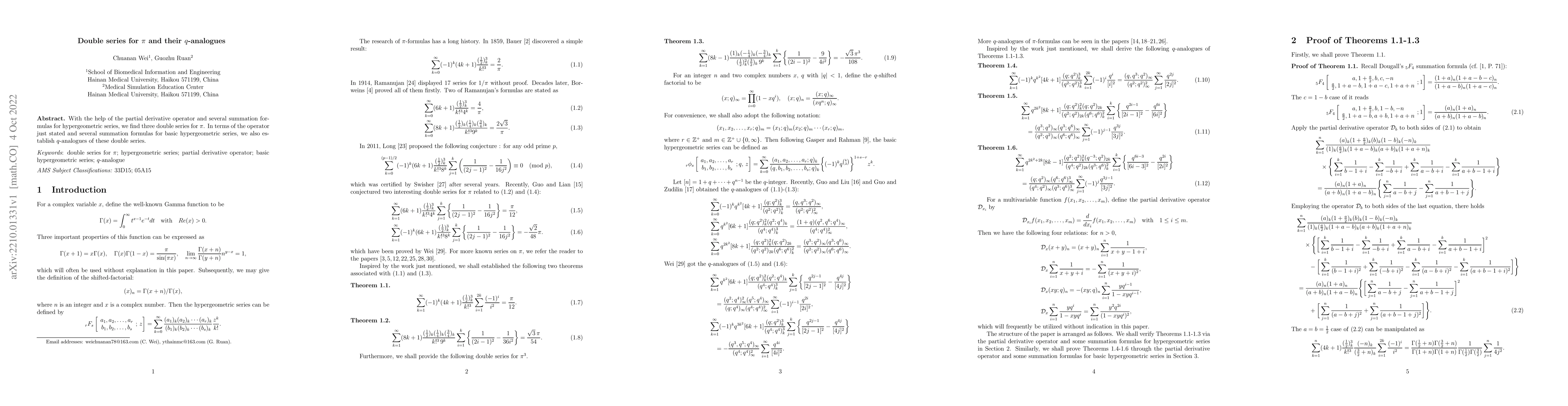 This paper presents three double series representations for $\pi$ derived using partial derivatives and hypergeometric series summation formulas. It also extends these results to $q$-analogues through similar techniques involving basic hypergeometric series.