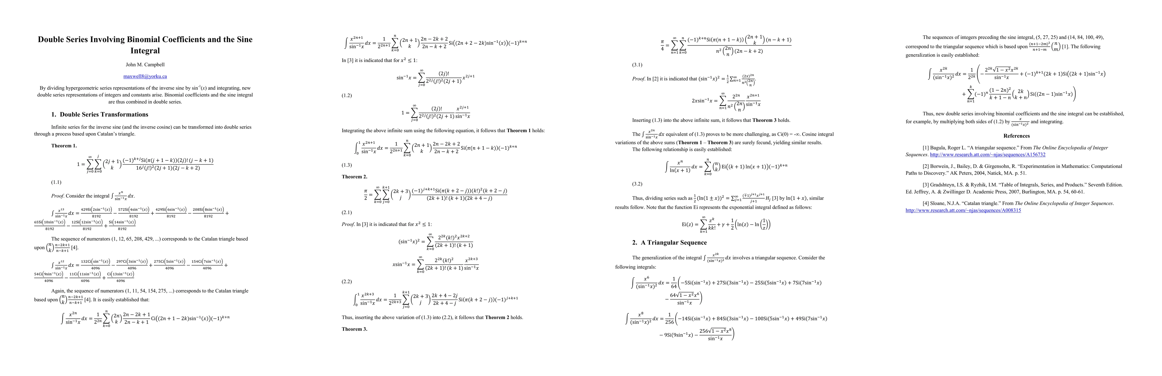 This paper explores new double series representations that arise from integrating hypergeometric series representations of the inverse sine function, combining binomial coefficients and the sine integral in the process. The results provide novel insights into the interplay between these mathematical constructs.