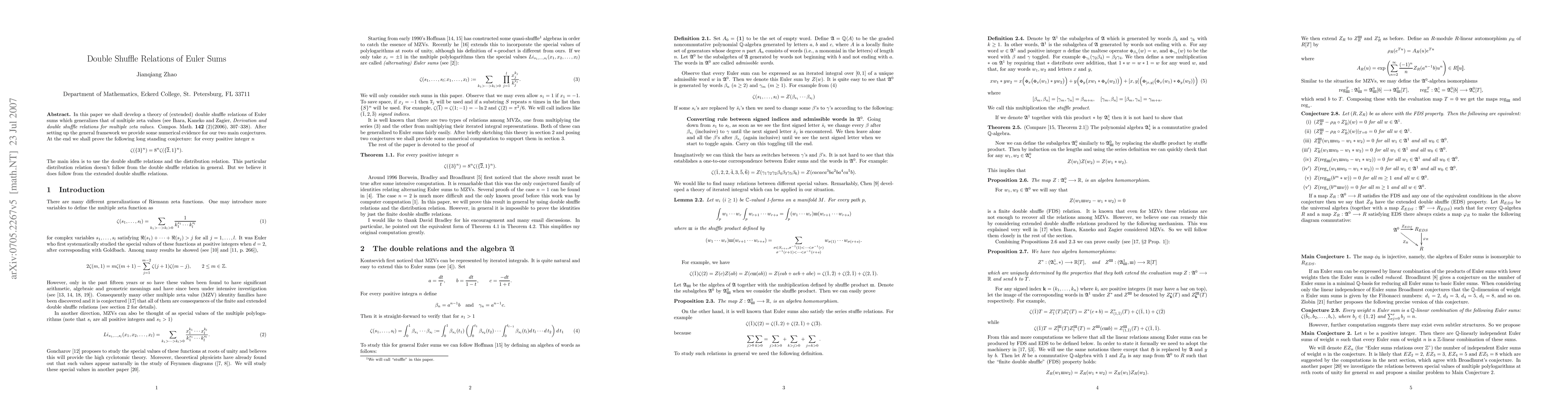 In this paper we shall develop a theory of (extended) double shuffle relations of Euler sums which generalizes that of multiple zeta values (see Ihara, Kaneko and Zagier, \emph{Derivation and double shuffle relations for multiple zeta values}. Compos. Math. \textbf{142} (2)(2006), 307--338). After setting up the general framework we provide some numerical evidence for our two main conjectures. At the end we shall prove the following long standing conjecture: for every positive integer n $$\zeta(\{3\}^n)=8^n\zeta(\{\ol2,1\}^n).$$ The main idea is to use the double shuffle relations and the distribution relation. This particular distribution relation doesn't follow from the double shuffle relation in general. But we believe it does follow from the extended double shuffle relations.