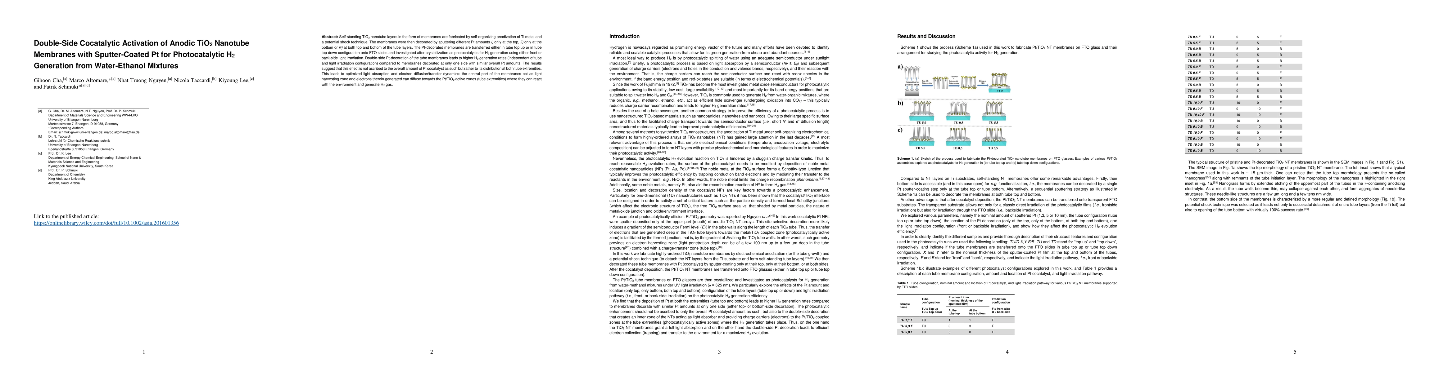 Self-standing TiO$_2$ nanotube layers in the form of membranes are fabricated by self-organizing anodization of Ti metal and a potential shock technique. The membranes were then decorated by sputtering different Pt amounts i) only at the top, ii) only at the bottom or iii) at both top and bottom of the tube layers. The Pt-decorated membranes are transferred either in tube top up or in tube top down configuration onto FTO slides and investigated after crystallization as photocatalysts for H$_2$ generation using either front or back-side light irradiation. Double-side Pt-decoration of the tube membranes leads to higher H$_2$ generation rates (independent of tube and light irradiation configuration) compared to membranes decorated at only one side with similar overall Pt amounts. The results suggest that this effect is not ascribed to the overall amount of Pt cocatalyst as such but rather to its distribution at both tube extremities. This leads to optimized light absorption and electron diffusion/transfer dynamics: the central part of the membranes act as light harvesting zone and electrons therein generated can diffuse towards the Pt/TiO$_2$ active zones (tube extremities) where they can react with the environment and generate H$_2$ gas.