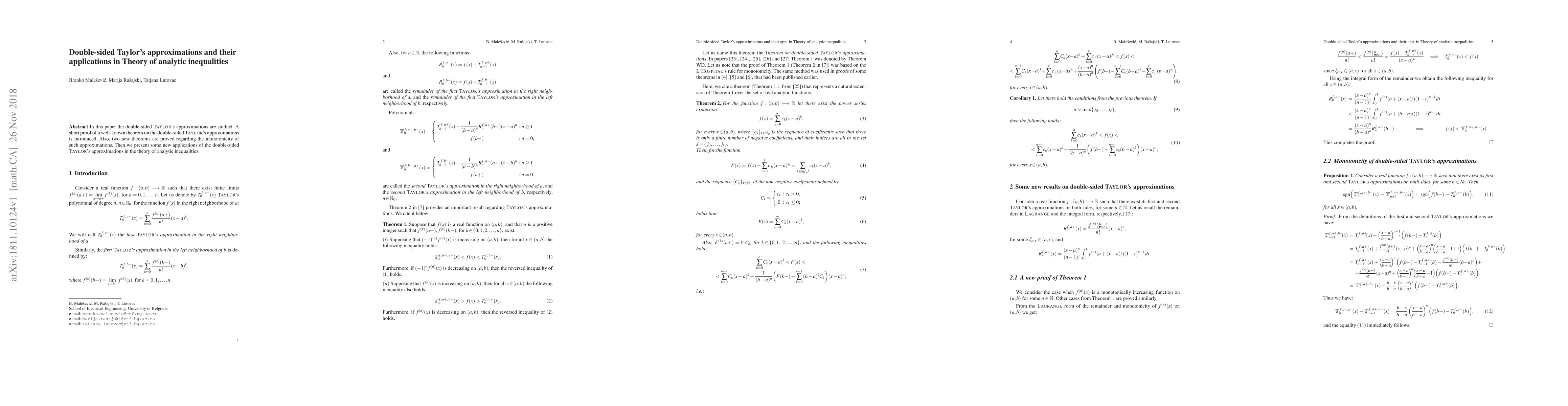 This paper explores double-sided Taylor's approximations, providing a concise proof of a known theorem and proving two new theorems on their monotonicity. It also demonstrates novel applications of these approximations in the theory of analytic inequalities.