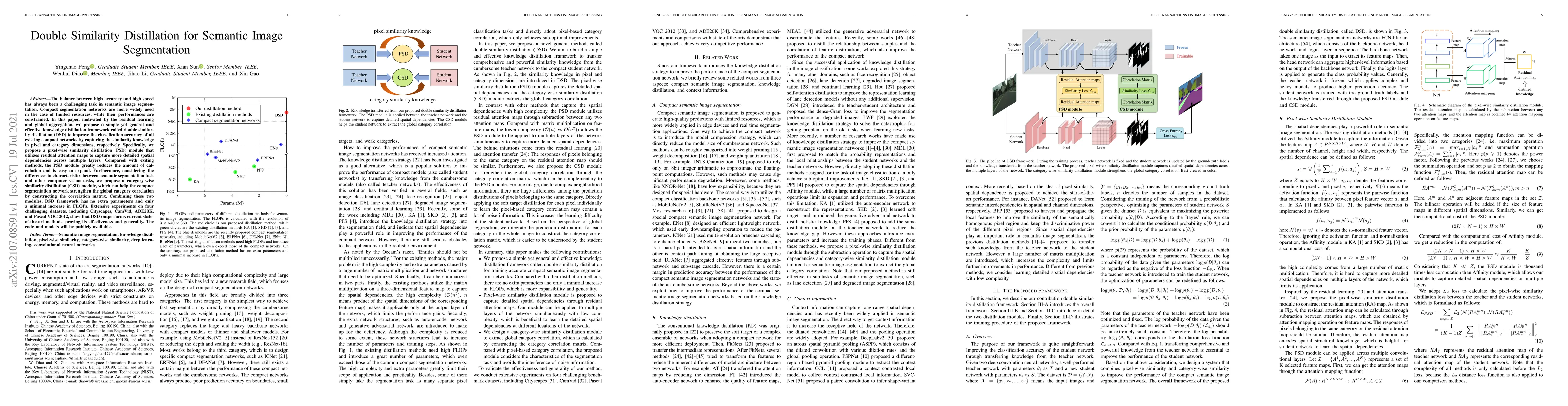 This paper proposes a Double Similarity Distillation (DSD) framework to enhance the accuracy of compact semantic segmentation networks by leveraging both pixel-wise and category-wise similarity knowledge. The DSD framework includes a Pixel-wise Similarity Distillation (PSD) module and a Category-wise Similarity Distillation (CSD) module, achieving superior performance with minimal computational overhead.