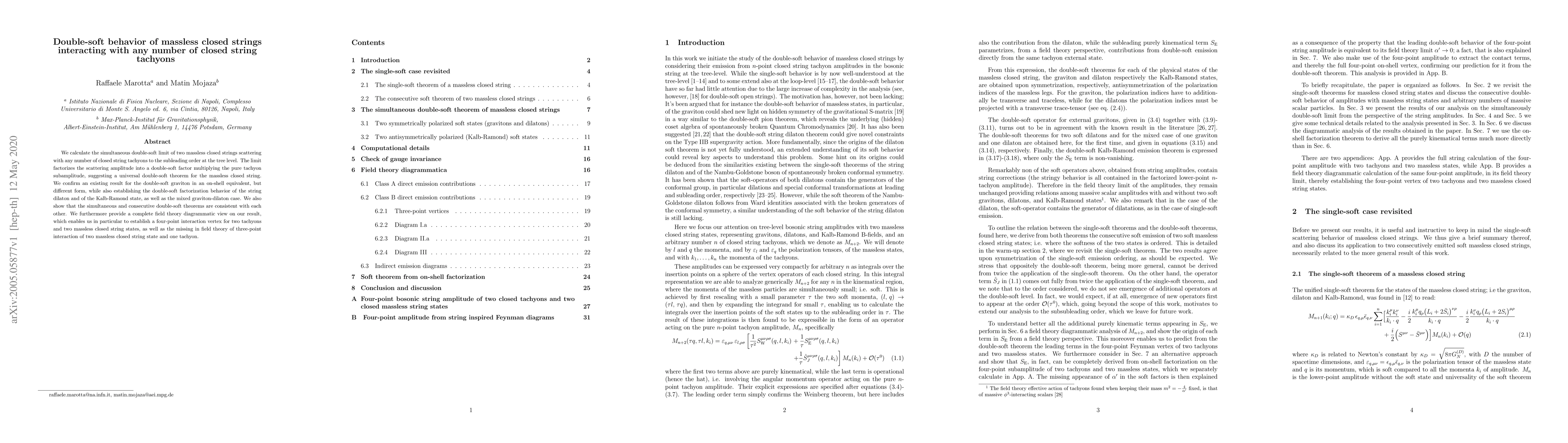 We calculate the simultaneous double-soft limit of two massless closed strings scattering with any number of closed string tachyons to the subleading order at the tree level. The limit factorizes the scattering amplitude into a double-soft factor multiplying the pure tachyon subamplitude, suggesting a universal double-soft theorem for the massless closed string. We confirm an existing result for the double-soft graviton in an on-shell equivalent, but different form, while also establishing the double-soft factorization behavior of the string dilaton and of the Kalb-Ramond state, as well as the mixed graviton-dilaton case. We also show that the simultaneous and consecutive double-soft theorems are consistent with each other. We furthermore provide a complete field theory diagrammatic view on our result, which enables us in particular to establish a four-point interaction vertex for two tachyons and two massless closed string states, as well as the missing in field theory of three-point interaction of two massless closed string state and one tachyon.