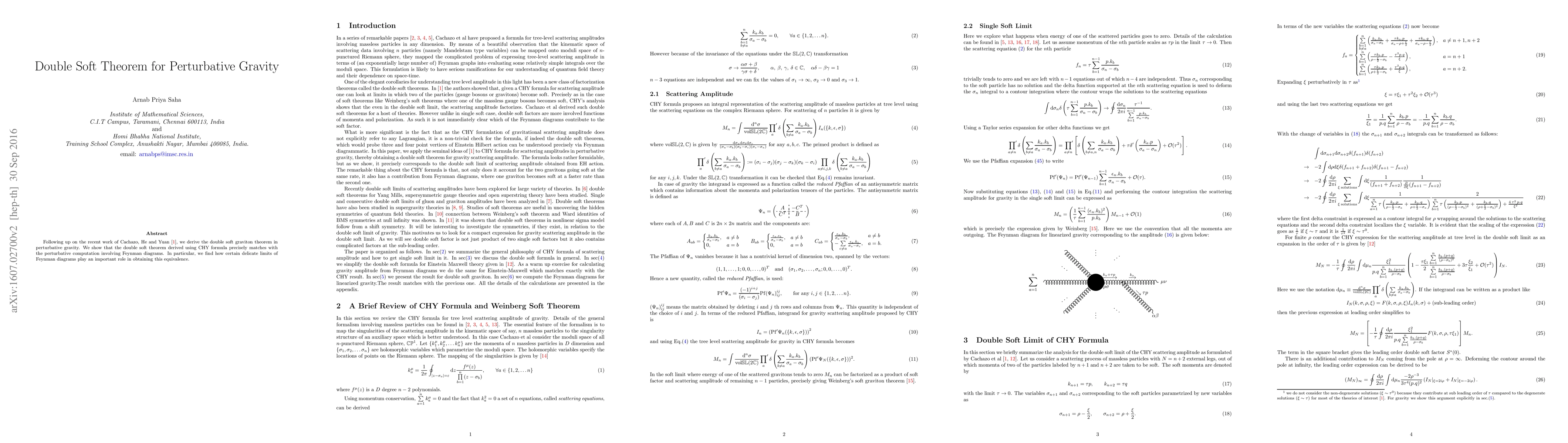 This paper derives the double soft graviton theorem in perturbative gravity, demonstrating that the result obtained via the CHY formula aligns perfectly with computations from Feynman diagrams, highlighting the importance of specific limits in achieving this equivalence.