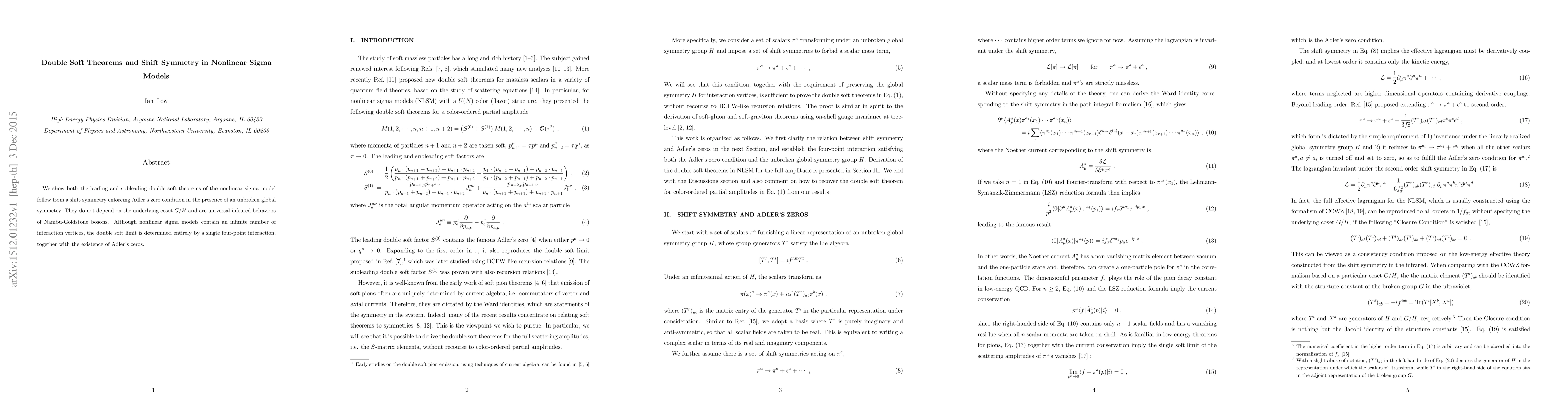 This paper demonstrates that both leading and subleading double soft theorems in nonlinear sigma models arise from a shift symmetry enforcing Adler's zero condition, revealing universal infrared behaviors of Nambu-Goldstone bosons independent of the coset G/H. The double soft limit is governed by a single four-point interaction and the presence of Adler's zeros.