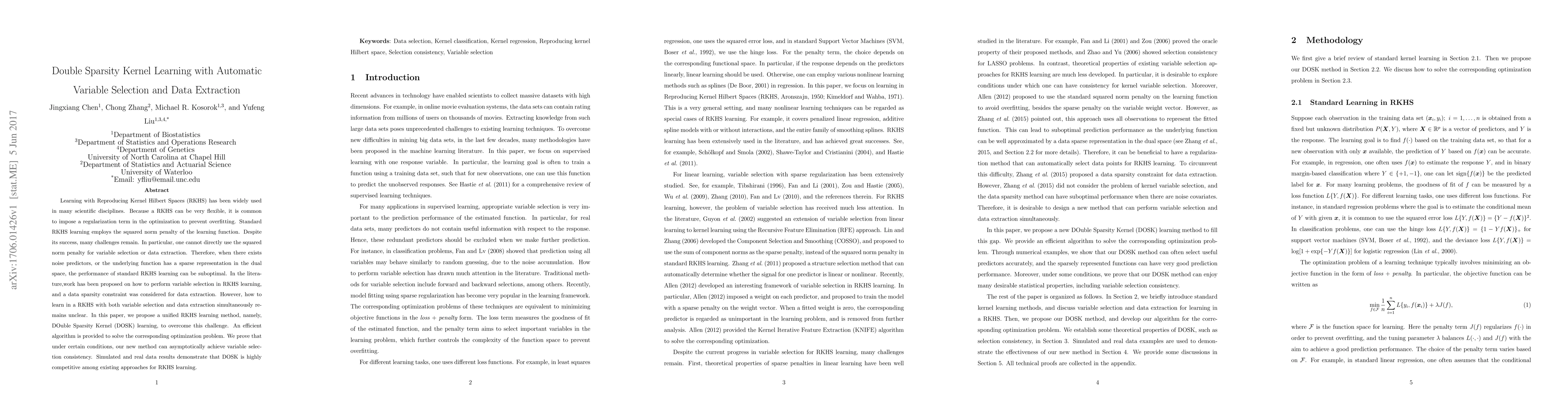 Learning with Reproducing Kernel Hilbert Spaces (RKHS) has been widely used in many scientific disciplines. Because a RKHS can be very flexible, it is common to impose a regularization term in the optimization to prevent overfitting. Standard RKHS learning employs the squared norm penalty of the learning function. Despite its success, many challenges remain. In particular, one cannot directly use the squared norm penalty for variable selection or data extraction. Therefore, when there exists noise predictors, or the underlying function has a sparse representation in the dual space, the performance of standard RKHS learning can be suboptimal. In the literature,work has been proposed on how to perform variable selection in RKHS learning, and a data sparsity constraint was considered for data extraction. However, how to learn in a RKHS with both variable selection and data extraction simultaneously remains unclear. In this paper, we propose a unified RKHS learning method, namely, DOuble Sparsity Kernel (DOSK) learning, to overcome this challenge. An efficient algorithm is provided to solve the corresponding optimization problem. We prove that under certain conditions, our new method can asymptotically achieve variable selection consistency. Simulated and real data results demonstrate that DOSK is highly competitive among existing approaches for RKHS learning.