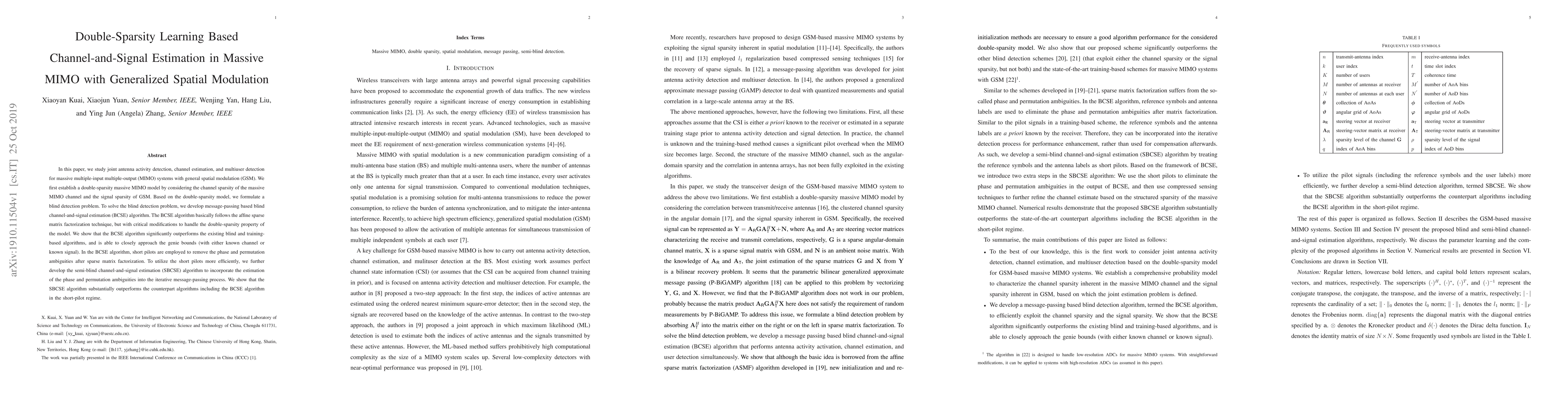 This paper proposes a double-sparsity model for massive MIMO systems with generalized spatial modulation, developing a blind channel-and-signal estimation (BCSE) algorithm that outperforms existing methods. It further introduces a semi-blind channel-and-signal estimation (SBCSE) algorithm that leverages short pilots to enhance performance in the short-pilot regime.