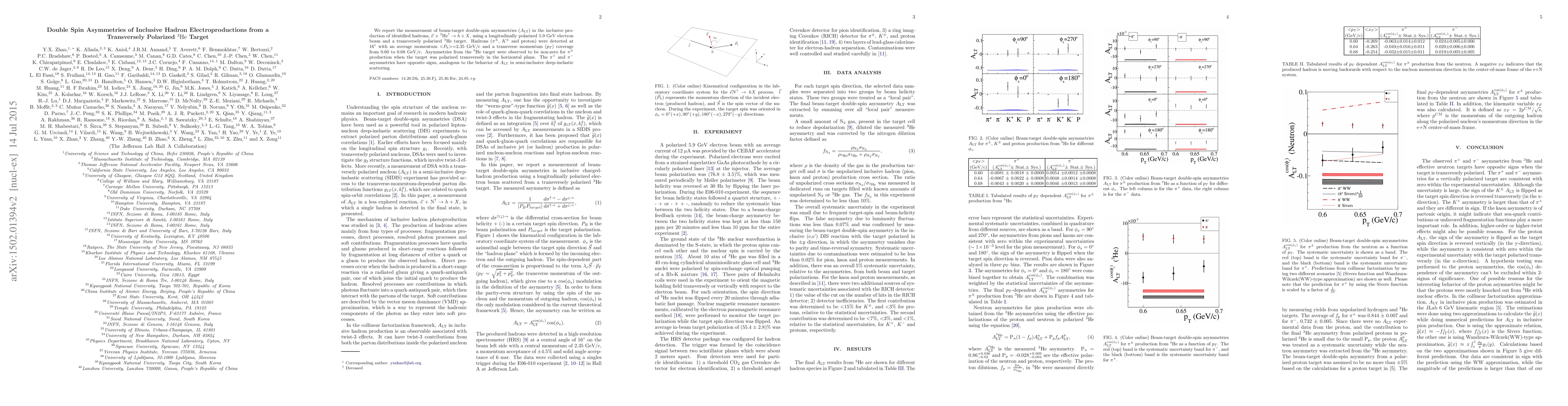 This study measures beam-target double-spin asymmetries in inclusive hadron electroproduction from a transversely polarized $^3\rm{He}$ target, revealing non-zero asymmetries for $\pi^{\pm}$ production with opposite signs for $\pi^{+}$ and $\pi^{-}$. The findings parallel $A_\text{LT}$ behavior in semi-inclusive deep-inelastic scattering.