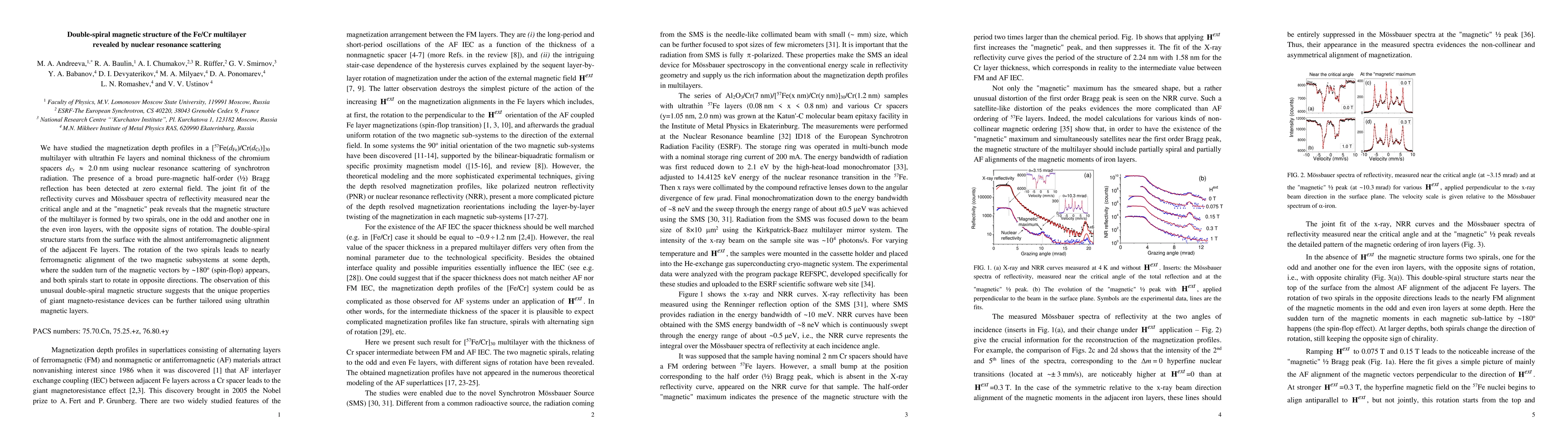 This study reveals a double-spiral magnetic structure in Fe/Cr multilayers using nuclear resonance scattering, showing two spirals with opposite rotations that lead to a nearly ferromagnetic alignment at depth. This unique magnetic structure suggests potential for tailoring giant magneto-resistance properties in devices.