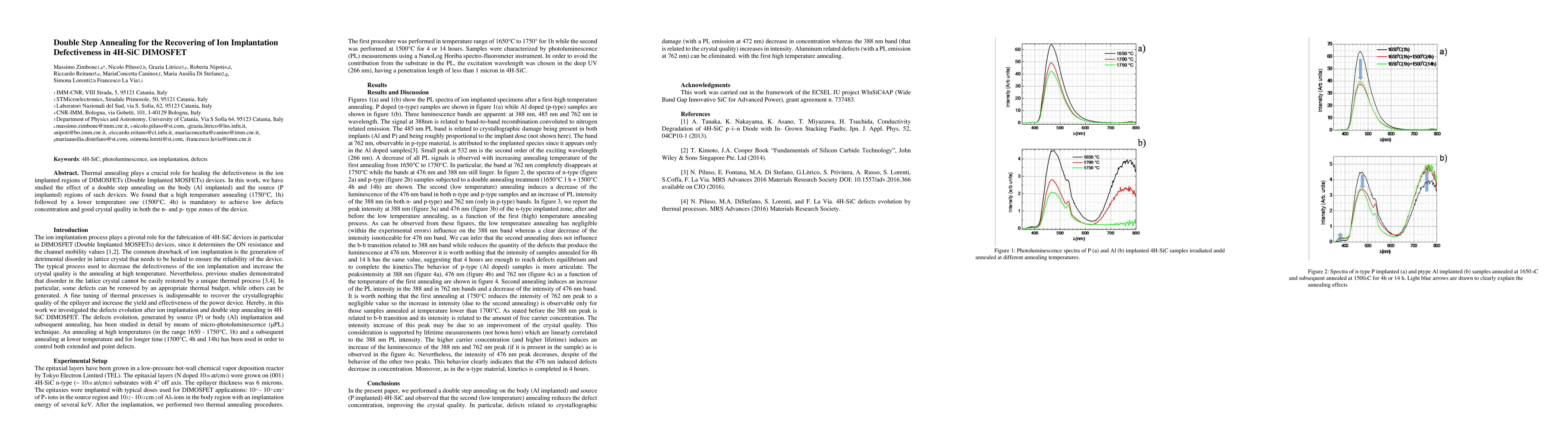This study investigates the impact of double step annealing on 4H-SiC DIMOSFET devices to recover defects from ion implantation. A high-temperature annealing step at 1750°C for 1 hour followed by a lower temperature step at 1500°C for 4 hours effectively reduces defect concentration and improves crystal quality in both n-type and p-type regions.