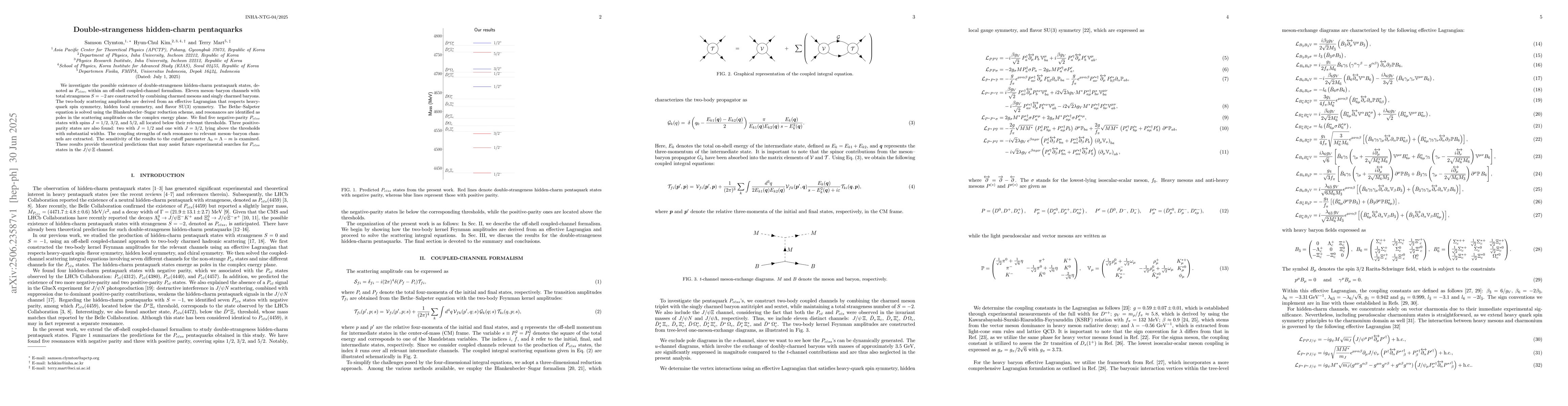 We investigate the possible existence of double-strangeness hidden-charm pentaquark states, denoted as $P_{c\bar{c}ss}$, within an off-shell coupled-channel formalism. Eleven meson-baryon channels with total strangeness $S = -2$ are constructed by combining charmed mesons and singly charmed baryons. The two-body scattering amplitudes are derived from an effective Lagrangian that respects heavy-quark spin symmetry, hidden local symmetry, and flavor SU(3) symmetry. The Bethe-Salpeter equation is solved using the Blankenbecler-Sugar reduction scheme, and resonances are identified as poles in the scattering amplitudes on the complex energy plane. We find five negative-parity $P_{c\bar{c}ss}$ states with spins $J = 1/2$, $3/2$, and $5/2$, all located below their relevant thresholds. Three positive-parity states are also found: two with $J = 1/2$ and one with $J = 3/2$, lying above the thresholds with substantial widths. The coupling strengths of each resonance to relevant meson-baryon channels are extracted. The sensitivity of the results to the cutoff parameter $\Lambda_0 = \Lambda - m$ is examined. These results provide theoretical predictions that may assist future experimental searches for $P_{c\bar{c}ss}$ states in the $J/\psi\,\Xi$ channel.