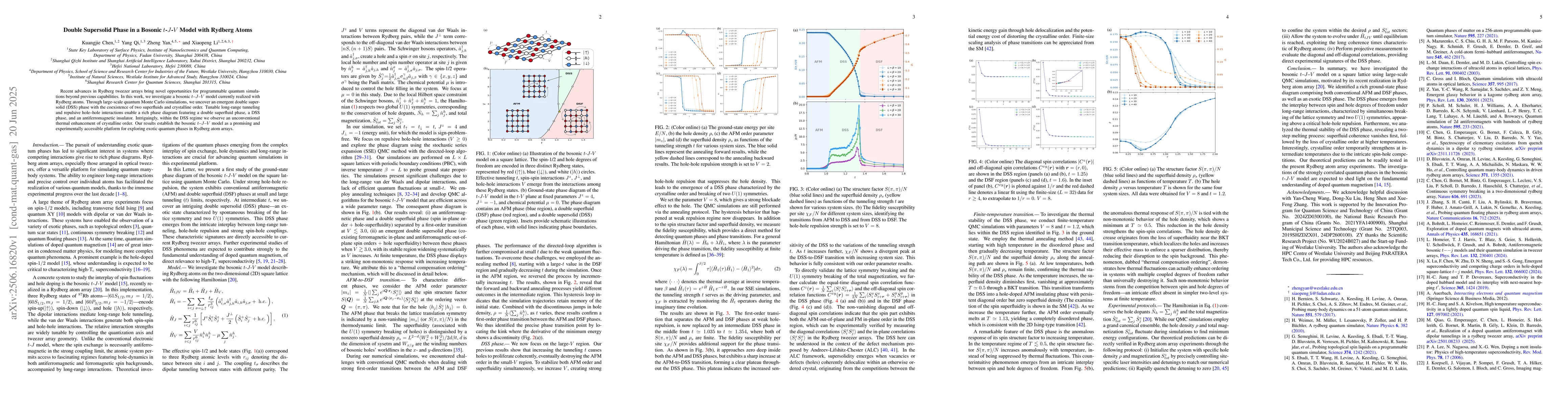 Recent advances in Rydberg tweezer arrays bring novel opportunities for programmable quantum simulations beyond previous capabilities. In this work, we investigate a bosonic t-J-V model currently realized with Rydberg atoms. Through large-scale quantum Monte Carlo simulations, we uncover an emergent double supersolid (DSS) phase with the coexistence of two superfluids and crystalline order. Tunable long-range tunneling and repulsive hole-hole interactions enable a rich phase diagram featuring a double superfluid phase, a DSS phase, and an antiferromagnetic insulator. Intriguingly, within the DSS regime we observe an unconventional thermal enhancement of crystalline order. Our results establish the bosonic t-J-V model as a promising and experimentally accessible platform for exploring exotic quantum phases in Rydberg atom arrays.