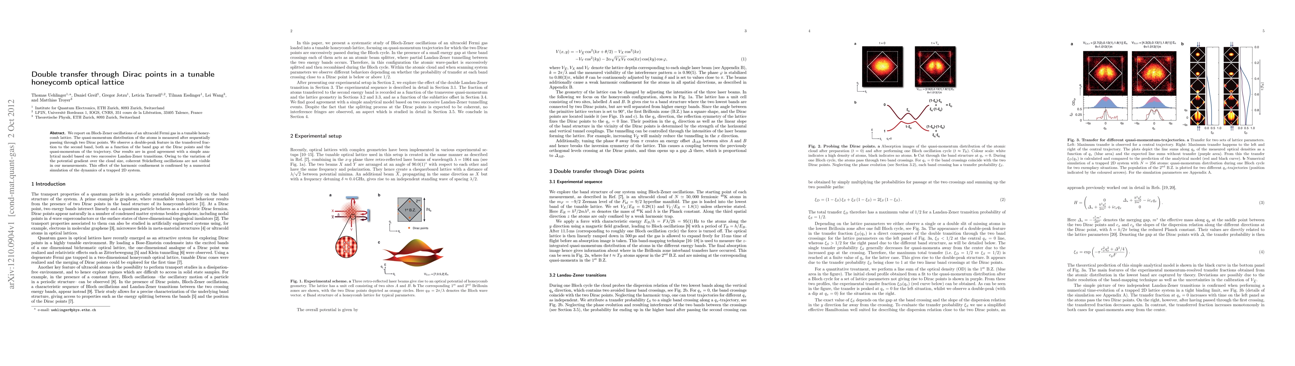 We report on Bloch-Zener oscillations of an ultracold Fermi gas in a tunable honeycomb lattice. The quasi-momentum distribution of the atoms is measured after sequentially passing through two Dirac points. We observe a double-peak feature in the transferred fraction to the second band, both as a function of the band gap at the Dirac points and the quasi-momentum of the trajectory. Our results are in good agreement with a simple analytical model based on two successive Landau-Zener transitions. Owing to the variation of the potential gradient over the cloud size, coherent St\"uckelberg oscillations are not visible in our measurements. This effect of the harmonic confinement is confirmed by a numerical simulation of the dynamics of a trapped 2D system.