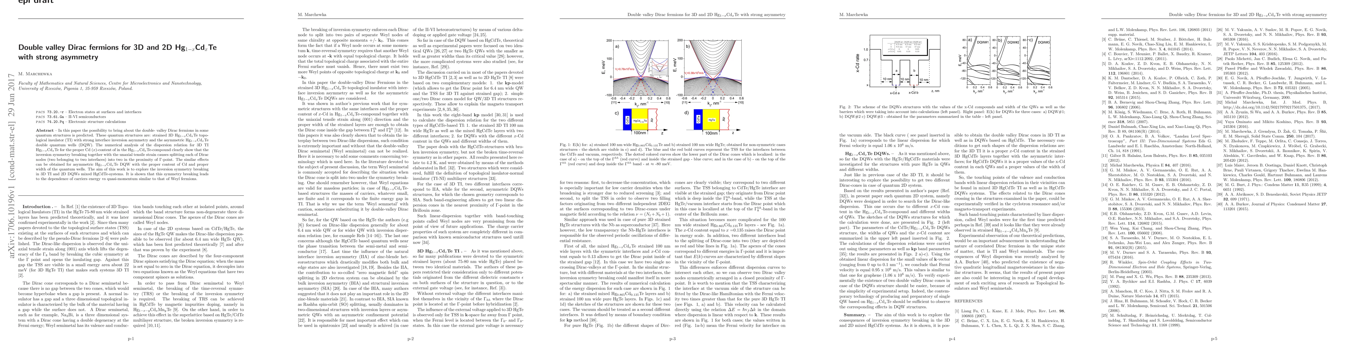 In this paper the possibility to bring about the double- valley Dirac fermions in some quantum structures is predicted. These quantum structures are: strained 3D Hg$_{1-x}$Cd$_x$Te topological insulator (TI) with strong interface inversion asymmetry and the asymmetric Hg$_{1-x}$Cd$_x$Te double quantum wells (DQW). The numerical analysis of the dispersion relation for 3D TI Hg$_{1-x}$Cd$_x$Te for the proper Cd ($x$)-content of in the Hg$_{1-x}$Cd$_x$Te-compound clearly show that the inversion symmetry breaking together with the unaxial tensile strain causes splitting each of Dirac nodes (two belonging to two interfaces) into two in the proximity of $\Gamma$-point. The similar effects can be obtained for asymmetric Hg$_{1-x}$Cd$_x$Te DQW with the proper content of Cd and proper width of the quantum wells. The aim of this work is to explore the inversion symmetry breaking in 3D TI and 2D DQWs mixed HgCdTe-systems. It is shown that this symmetry breaking leads to the dependence of carriers energy vs quasi-momentum similar to that of Weyl fermions.