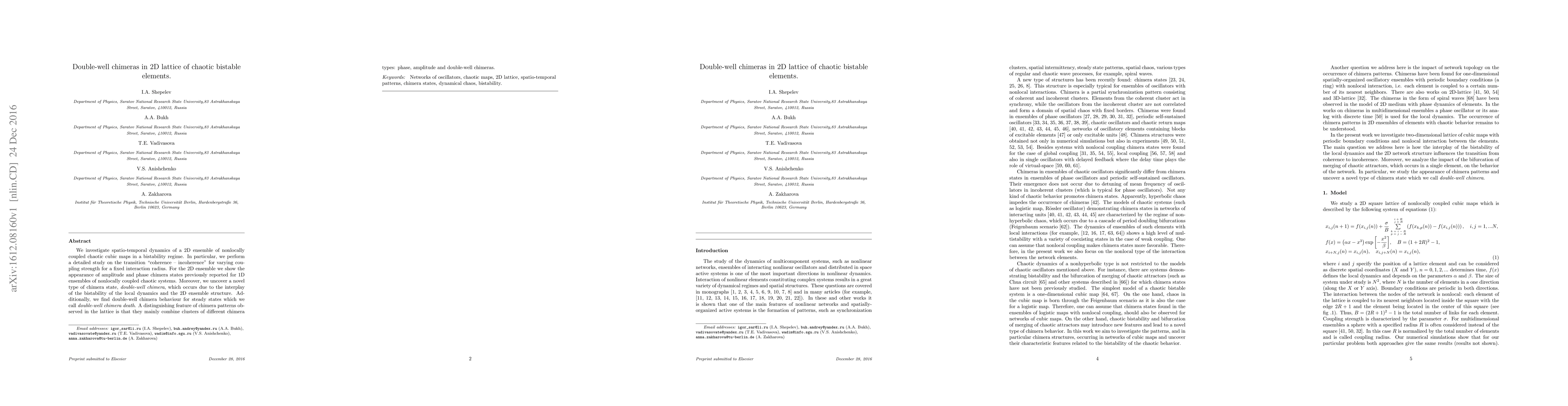 We investigate spatio-temporal dynamics of a 2D ensemble of nonlocally coupled chaotic cubic maps in a bistability regime. In particular, we perform a detailed study on the transition "coherence -- incoherence" for varying coupling strength for a fixed interaction radius. For the 2D ensemble we show the appearance of amplitude and phase chimera states previously reported for 1D ensembles of nonlocally coupled chaotic systems. Moreover, we uncover a novel type of chimera state, double-well chimera, which occurs due to the interplay of the bistability of the local dynamics and the 2D ensemble structure. Additionally, we find double-well chimera behaviour for steady states which we call double-well chimera death. A distinguishing feature of chimera patterns observed in the lattice is that they mainly combine clusters of different chimera types: phase, amplitude and double-well chimeras.