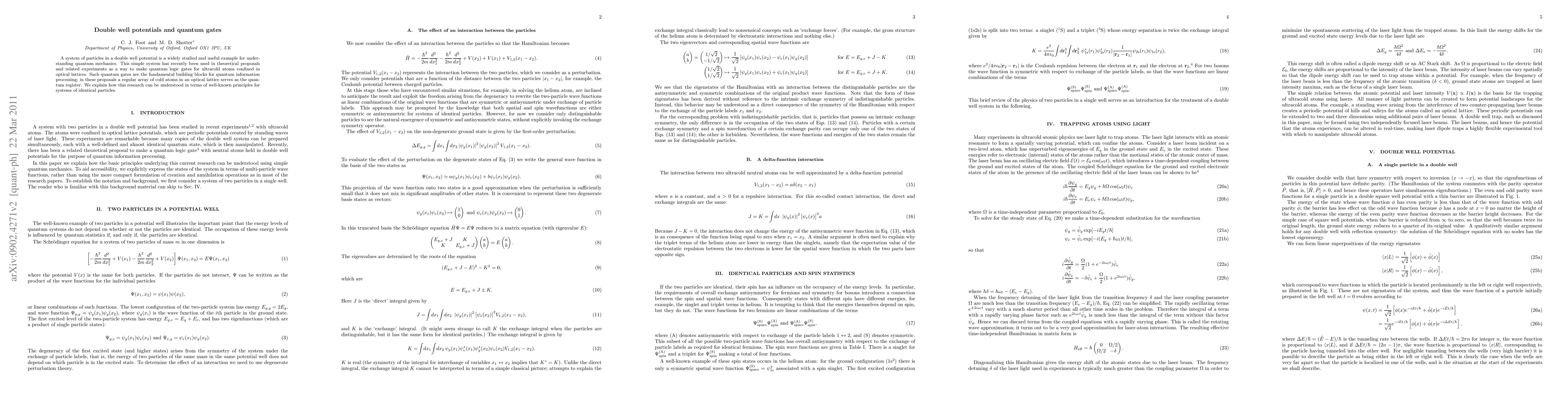 The quantum system of particles in a double well potential is a widely studied and extremely useful example for understanding quantum mechanics. This simple system has recently been used in theoretical proposals and related experiments as a way to make quantum logic gates for ultra-cold atoms confined in optical lattices (periodic potentials arising from the interaction of atoms with standing waves of laser light). Such quantum gates are the fundamental building blocks for quantum information processing; in this context the regular array of cold atoms in the optical lattice serves as the quantum register. The purpose of this paper is to explain how this current research can be understood in terms of well-known principles for systems of identical particles, and hence furnish an up-to-date example for the teaching of quantum mechanics.