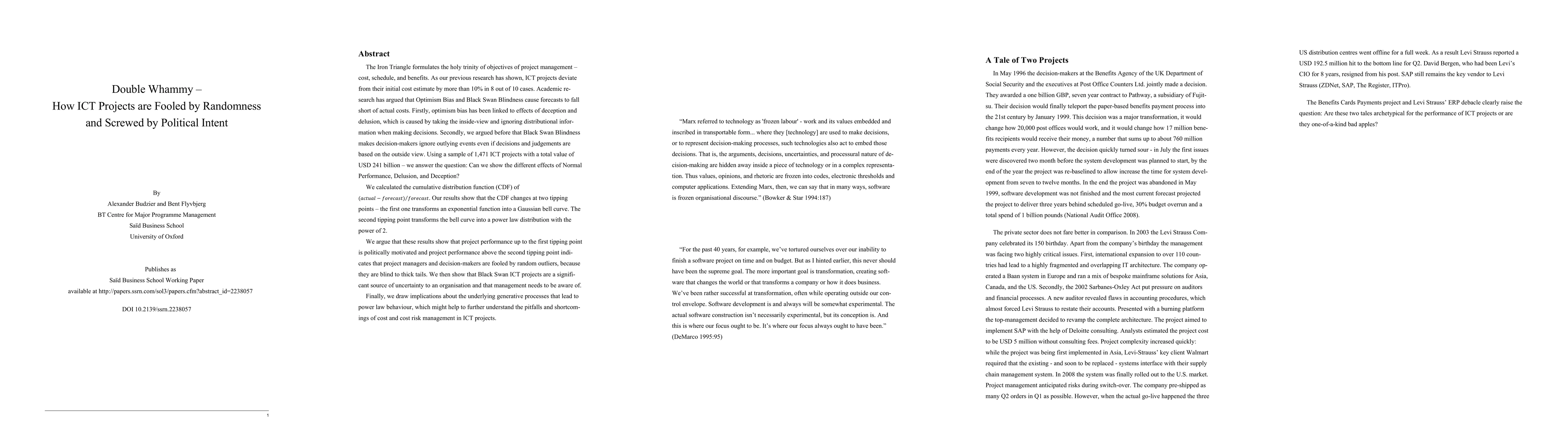 The cost-benefit analysis formulates the holy trinity of objectives of project management - cost, schedule, and benefits. As our previous research has shown, ICT projects deviate from their initial cost estimate by more than 10% in 8 out of 10 cases. Academic research has argued that Optimism Bias and Black Swan Blindness cause forecasts to fall short of actual costs. Firstly, optimism bias has been linked to effects of deception and delusion, which is caused by taking the inside-view and ignoring distributional information when making decisions. Secondly, we argued before that Black Swan Blindness makes decision-makers ignore outlying events even if decisions and judgements are based on the outside view. Using a sample of 1,471 ICT projects with a total value of USD 241 billion - we answer the question: Can we show the different effects of Normal Performance, Delusion, and Deception? We calculated the cumulative distribution function (CDF) of (actual-forecast)/forecast. Our results show that the CDF changes at two tipping points - the first one transforms an exponential function into a Gaussian bell curve. The second tipping point transforms the bell curve into a power law distribution with the power of 2. We argue that these results show that project performance up to the first tipping point is politically motivated and project performance above the second tipping point indicates that project managers and decision-makers are fooled by random outliers, because they are blind to thick tails. We then show that Black Swan ICT projects are a significant source of uncertainty to an organisation and that management needs to be aware of.