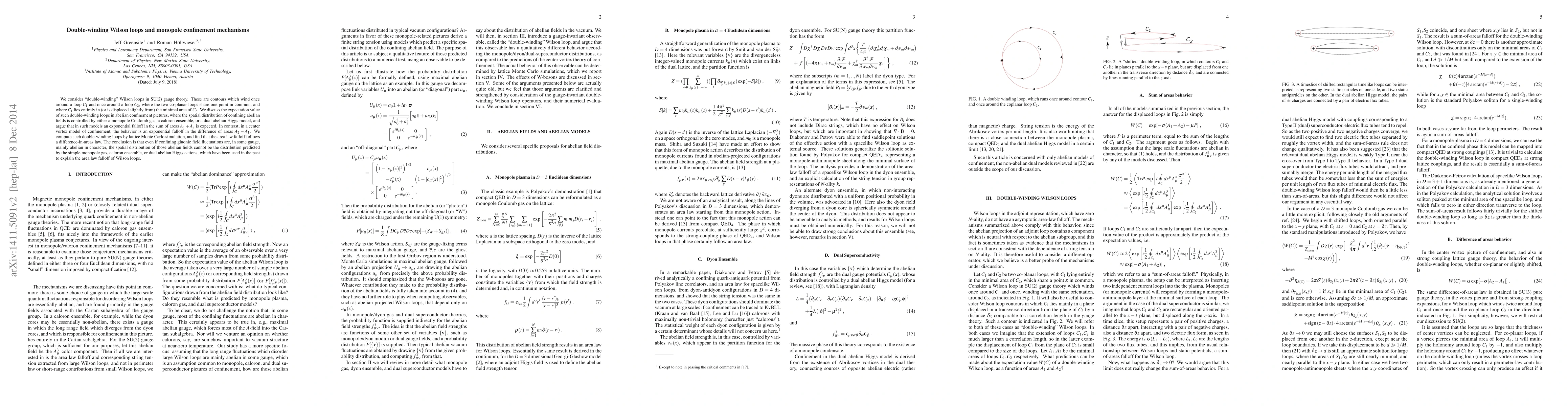 This paper examines double-winding Wilson loops in SU(2) gauge theory and finds that their expectation values follow an exponential falloff in the difference of areas rather than the sum, as predicted by monopole confinement mechanisms. The study concludes that the spatial distribution of abelian fields cannot be explained by traditional monopole gas, caloron ensemble, or dual abelian Higgs models.