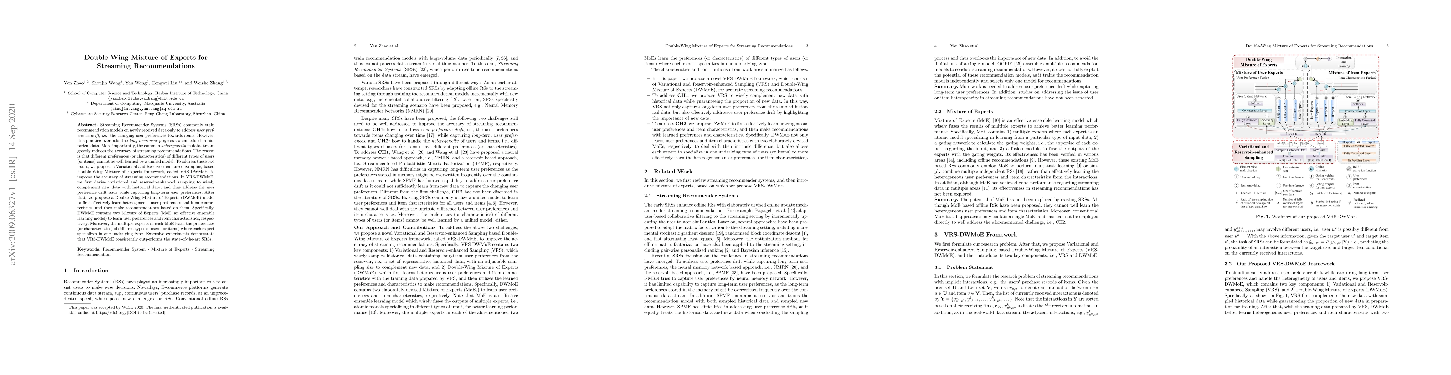 The paper proposes a VRS-DWMoE framework to enhance streaming recommender systems by integrating variational and reservoir-enhanced sampling to balance new and historical data, and a Double-Wing Mixture of Experts model to effectively learn and leverage heterogeneous user and item preferences, leading to improved recommendation accuracy. Experimental results show VRS-DWMoE outperforms existing state-of-the-art methods.
