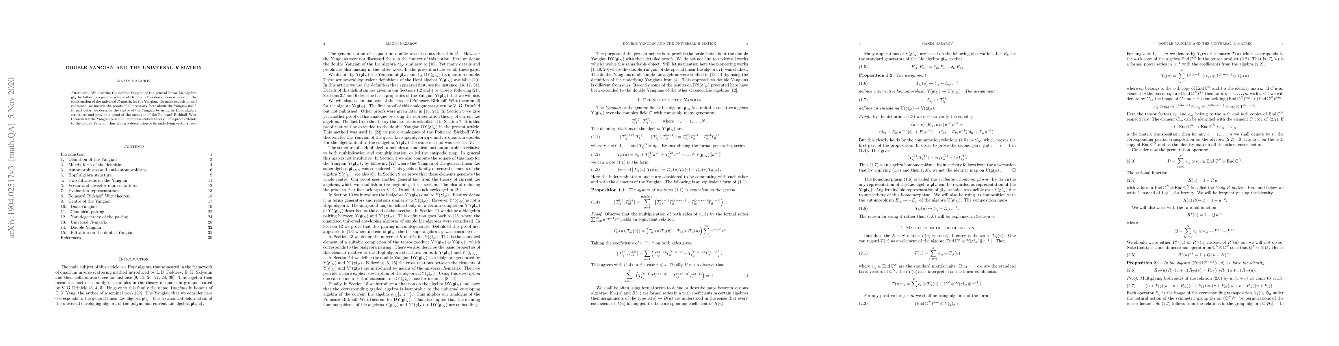 This paper describes the double Yangian of $\mathfrak{gl}_N$ using Drinfeld's scheme, focusing on the construction of the universal $R$-matrix for the Yangian. It includes proofs of essential facts about the Yangian, such as its center and a representation-theoretic proof of the Poincaré-Birkhoff-Witt theorem, which extends to describe the double Yangian's vector space.