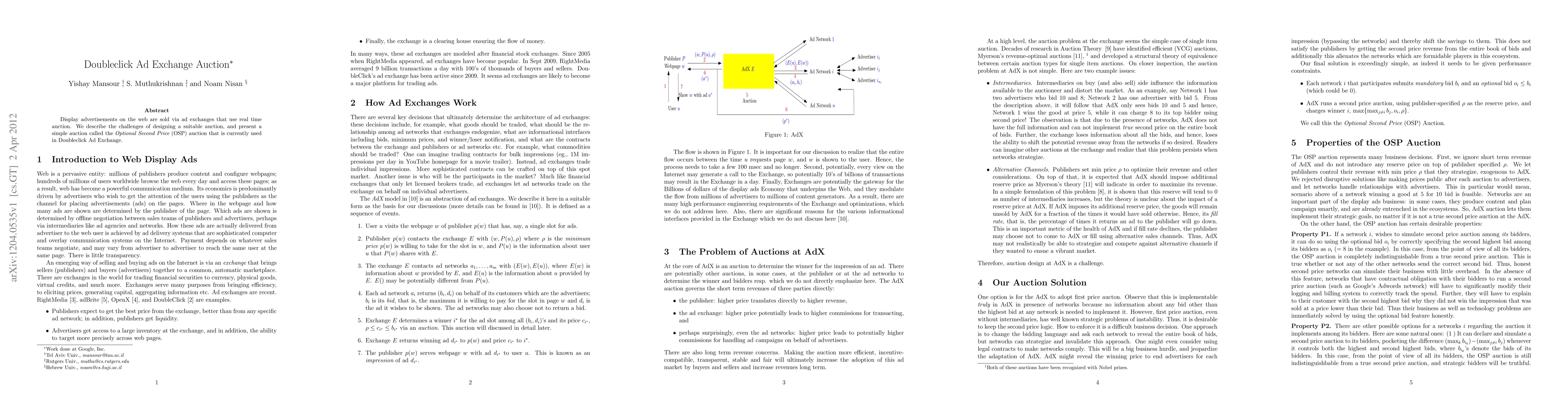 This paper discusses the complexities of designing an effective auction mechanism for real-time web display advertisements and introduces the Optional Second Price (OSP) auction used by Doubleclick Ad Exchange to address these challenges. The OSP auction aims to improve efficiency and fairness in the ad exchange market.