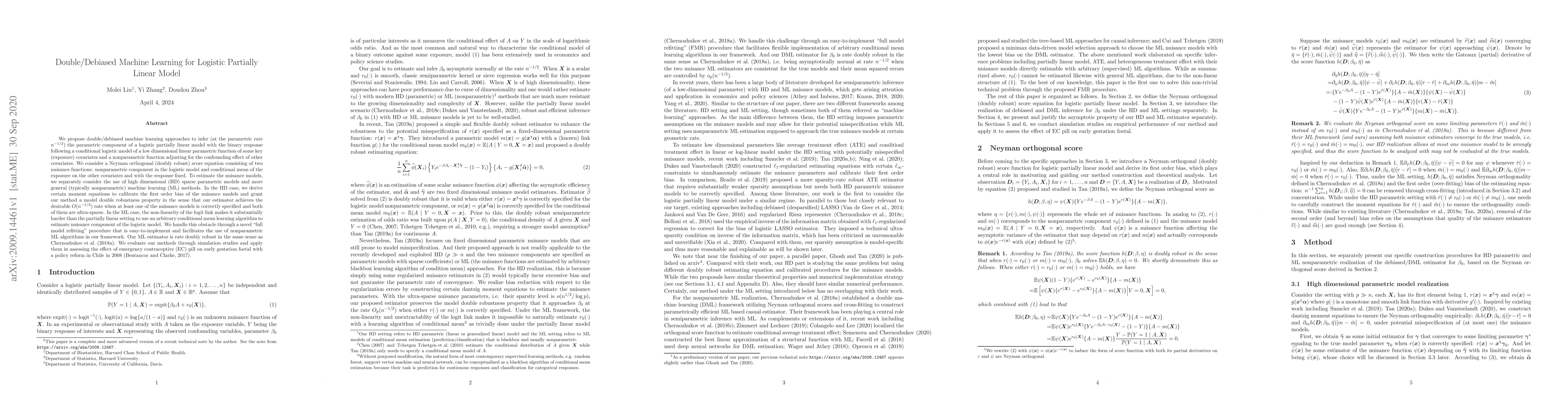 This paper proposes double/debiased machine learning techniques to estimate the parametric component of a logistic partially linear model at the parametric rate. It introduces a Neyman orthogonal score equation and uses high-dimensional sparse models or machine learning methods to estimate the nuisance functions, achieving model double robustness when at least one model is correctly specified.