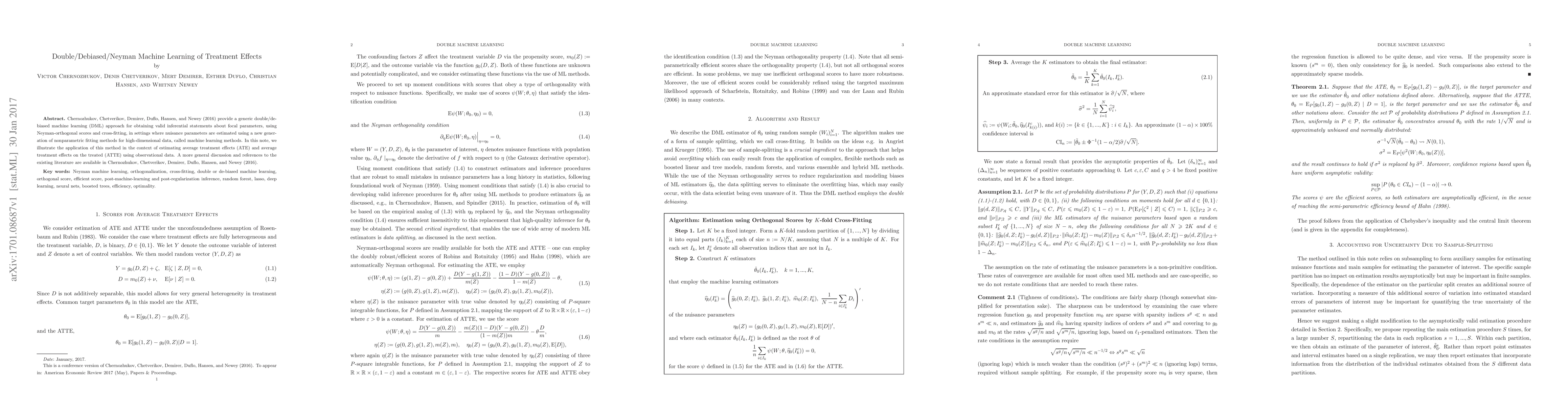 Chernozhukov, Chetverikov, Demirer, Duflo, Hansen, and Newey (2016) provide a generic double/de-biased machine learning (DML) approach for obtaining valid inferential statements about focal parameters, using Neyman-orthogonal scores and cross-fitting, in settings where nuisance parameters are estimated using a new generation of nonparametric fitting methods for high-dimensional data, called machine learning methods. In this note, we illustrate the application of this method in the context of estimating average treatment effects (ATE) and average treatment effects on the treated (ATTE) using observational data. A more general discussion and references to the existing literature are available in Chernozhukov, Chetverikov, Demirer, Duflo, Hansen, and Newey (2016).