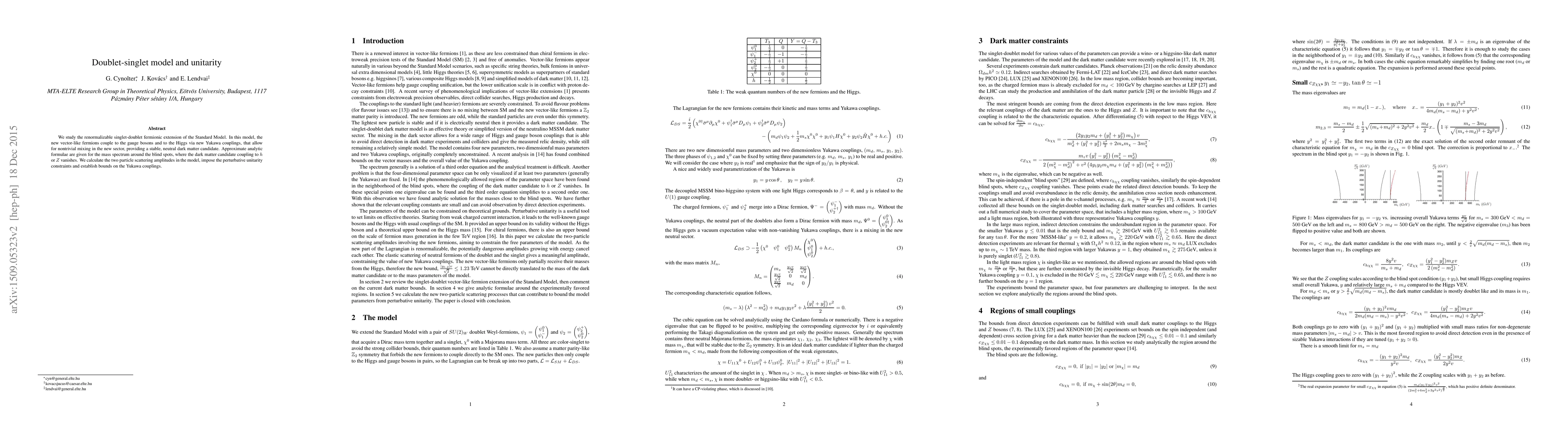 We study the renormalizable singlet-doublet fermionic extension of the Standard Model. In this model, the new vector-like fermions couple to the gauge bosons and to the Higgs via new Yukawa couplings, that allow for nontrivial mixing in the new sector, providing a stable, neutral dark matter candidate. Approximate analytic formulae are given for the mass spectrum around the blind spots, where the dark matter candidate coupling to $h$ or $Z$ vanishes. We calculate the two particle scattering amplitudes in the model, impose the perturbative unitarity constraints and establish bounds on the Yukawa couplings.