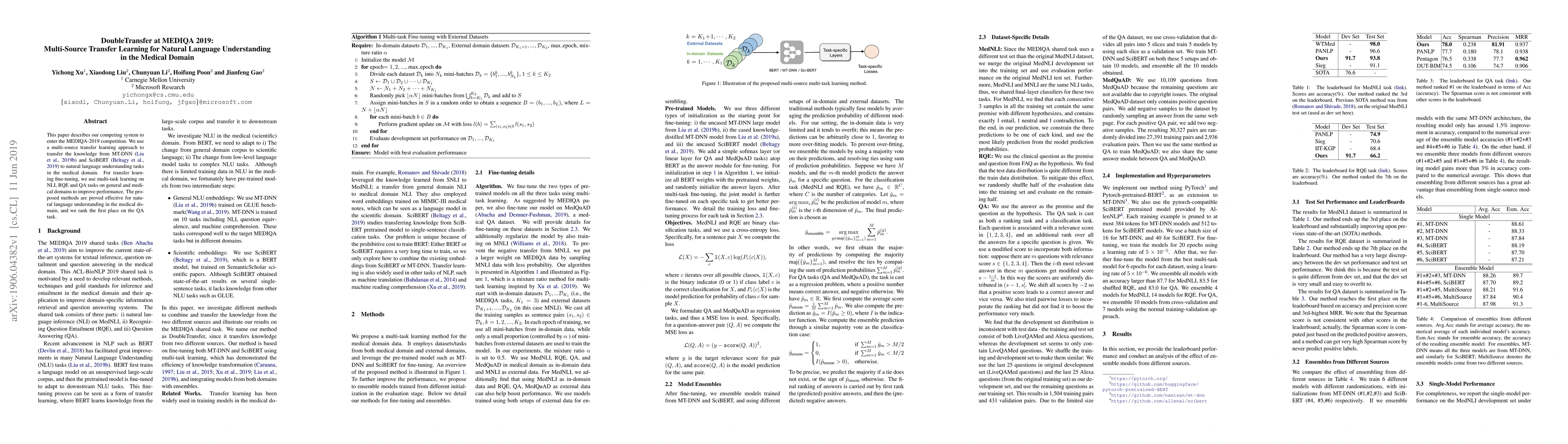 This paper describes our competing system to enter the MEDIQA-2019 competition. We use a multi-source transfer learning approach to transfer the knowledge from MT-DNN and SciBERT to natural language understanding tasks in the medical domain. For transfer learning fine-tuning, we use multi-task learning on NLI, RQE and QA tasks on general and medical domains to improve performance. The proposed methods are proved effective for natural language understanding in the medical domain, and we rank the first place on the QA task.