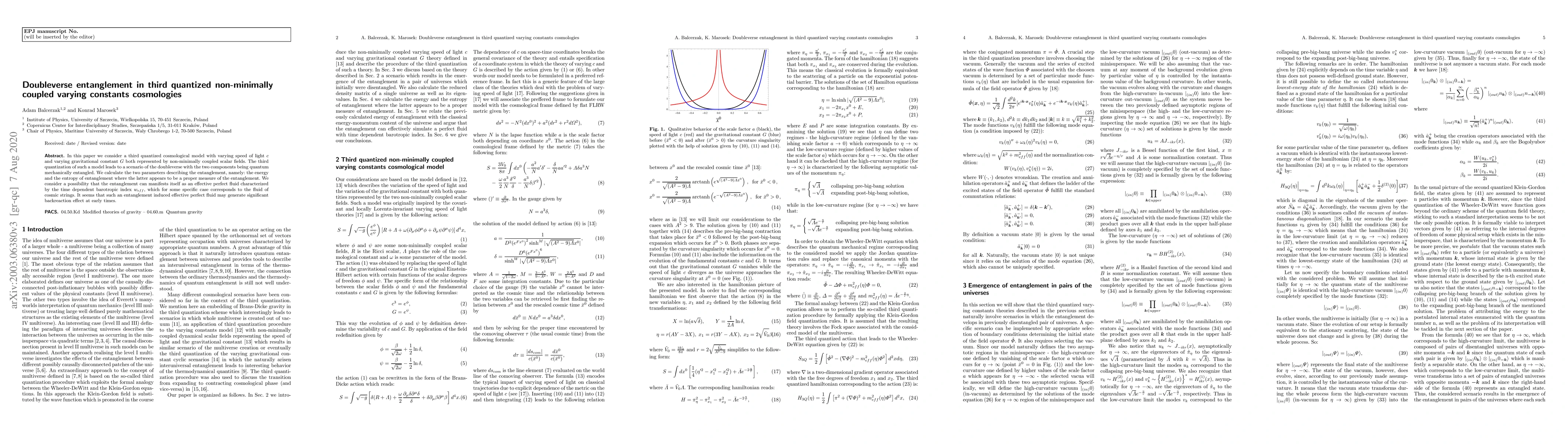 This paper explores a third quantized cosmological model with varying constants $c$ and $G$ via non-minimally coupled scalar fields, leading to a doubleverse scenario where two components are quantum mechanically entangled. The study calculates the energy and entropy of entanglement, suggesting the latter as a proper entanglement measure.