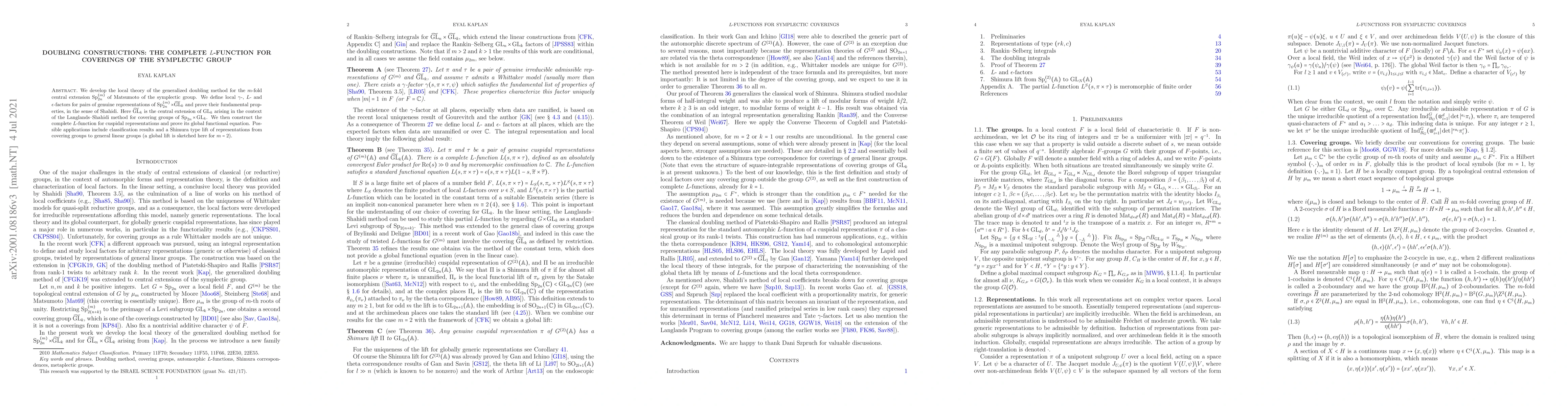 We develop the local theory of the generalized doubling method for the $m$-fold central extension $Sp_{2n}^{(m)}$ of Matsumoto of the symplectic group. We define local $\gamma$-, $L$- and $\epsilon$-factors for pairs of genuine representations of $Sp_{2n}^{(m)}\times\widetilde{GL}_k$ and prove their fundamental properties, in the sense of Shahidi. Here $\widetilde{GL}_k$ is the central extension of $GL_k$ arising in the context of the Langlands--Shahidi method for covering groups of $Sp_{2n}\times GL_k$. We then construct the complete $L$-function for cuspidal representations and prove its global functional equation. Possible applications include classification results and a Shimura type lift of representations from covering groups to general linear groups (a global lift is sketched here for $m=2$).