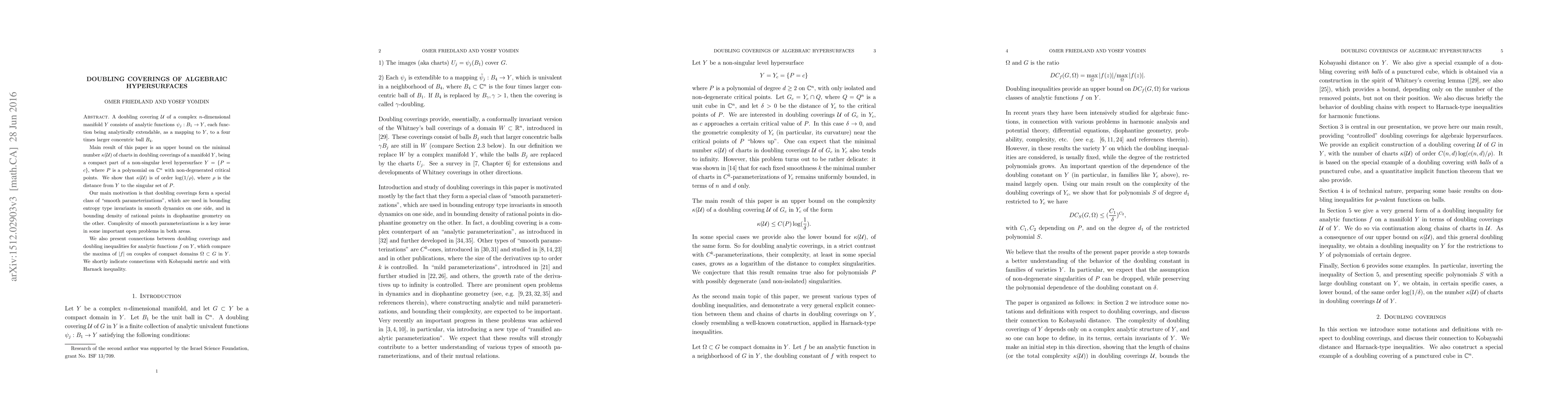 A doubling covering $\U$ of a complex $n$-dimensional manifold $Y$ consists of analytic functions $\psi_j:B_1\to Y$, each function being analytically extendable, as a mapping to $Y$, to a four times larger concentric ball $B_4$. Main result of this paper is an upper bound on the minimal number $\kappa({\U})$ of charts in doubling coverings of a manifold $Y$, being a compact part of a non-singular level hypersurface $Y=\{P=c\}$, where $P$ is a polynomial on $\C^n$ with non-degenerated critical points. We show that $\kappa({\U})$ is of order $\log({1}/{\rho})$, where $\rho$ is the distance from $Y$ to the singular set of $P$. Our main motivation is that doubling coverings form a special class of "smooth parameterizations", which are used in bounding entropy type invariants in smooth dynamics on one side, and in bounding density of rational points in diophantine geometry on the other. Complexity of smooth parameterizations is a key issue in some important open problems in both areas. We also present connections between doubling coverings and doubling inequalities for analytic functions $f$ on $Y$, which compare the maxima of $|f|$ on couples of compact domains $\Omega\subset G$ in $Y$. We shortly indicate connections with Kobayashi metric and with Harnack inequality.