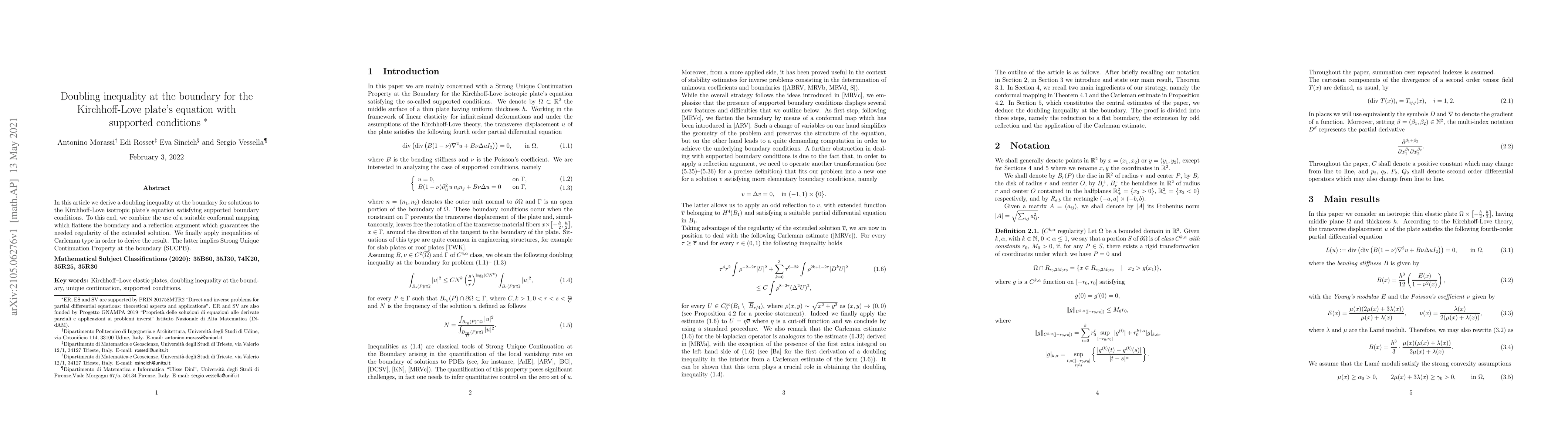 In this article we derive a doubling inequality at the boundary for solutions to the Kirchhoff-Love isotropic plate's equation satisfying supported boundary conditions. To this end, we combine the use of a suitable conformal mapping which flattens the boundary and a reflection argument which guarantees the needed regularity of the extended solution. We finally apply inequalities of Carleman type in order to derive the result. The latter implies Strong Unique Continuation Property at the boundary (SUCPB).