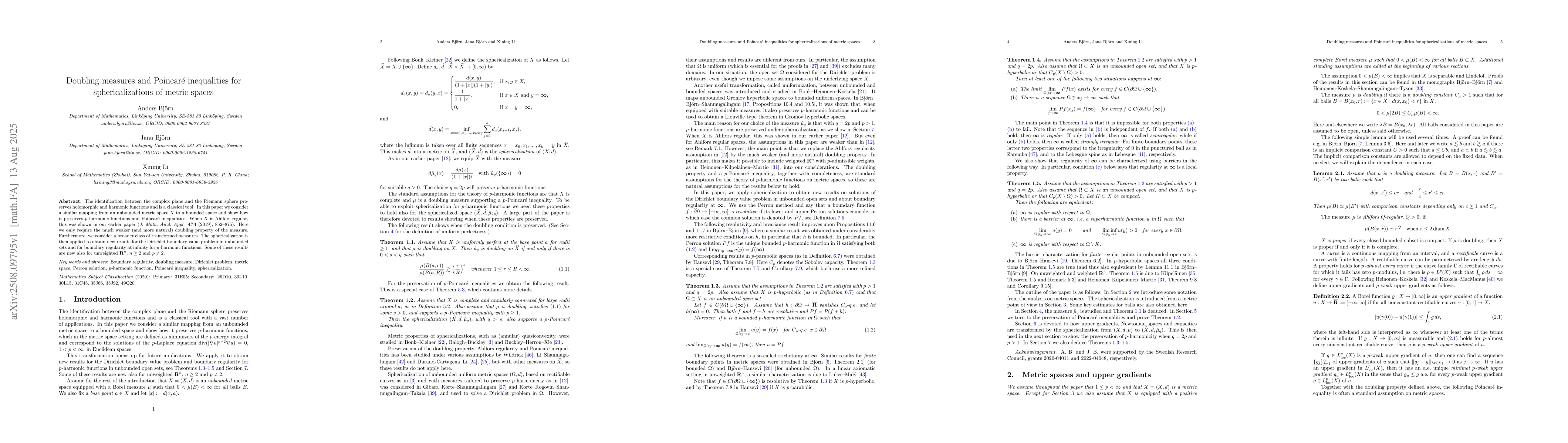 The identification between the complex plane and the Riemann sphere preserves holomorphic and harmonic functions and is a classical tool. In this paper we consider a similar mapping from an unbounded metric space $X$ to a bounded space and show how it preserves $p$-harmonic functions and Poincar\'e inequalities. When $X$ is Ahlfors regular, this was shown in our earlier paper (J. Math. Anal. Appl. 474 (2019), 852-875). Here we only require the much weaker (and more natural) doubling property of the measure. Furthermore, we consider a broader class of transformed measures. The sphericalization is then applied to obtain new results for the Dirichlet boundary value problem in unbounded sets and for boundary regularity at infinity for $p$-harmonic functions. Some of these results are new also for unweighted $\mathbf{R}^n$, $n \ge 2$ and $p\ne2$.