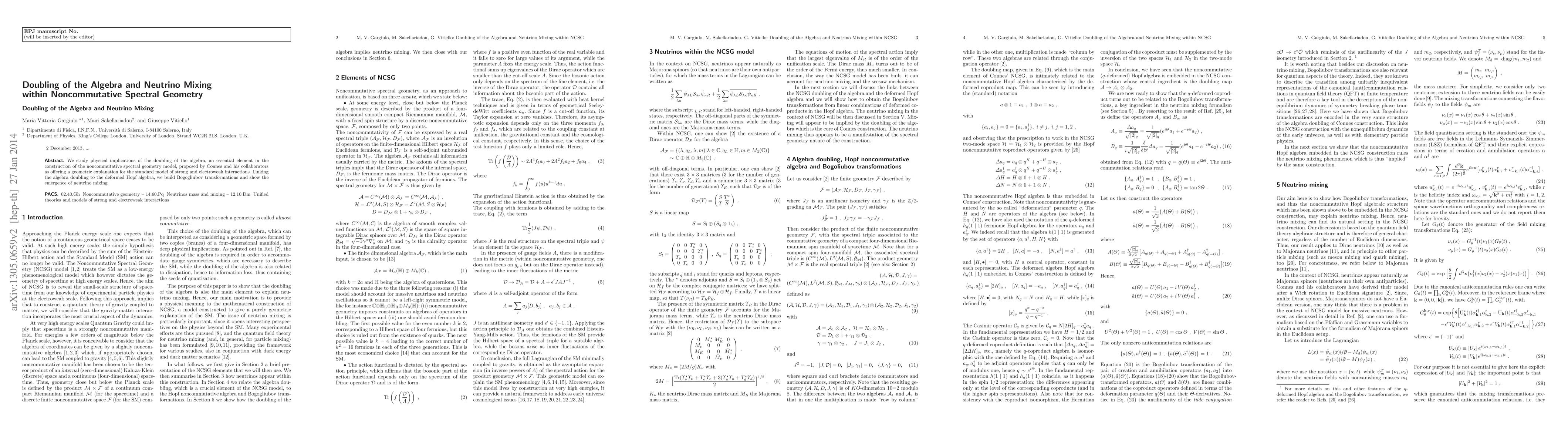 Title: Doubling of the Algebra and Neutrino Mixing within Noncommutative Spectral Geometry Summary: This paper explores the implications of the algebra doubling in Connes' noncommutative spectral geometry, demonstrating its connection to deformed Hopf algebra, Bogogliubov transformations, and the emergence of neutrino mixing.