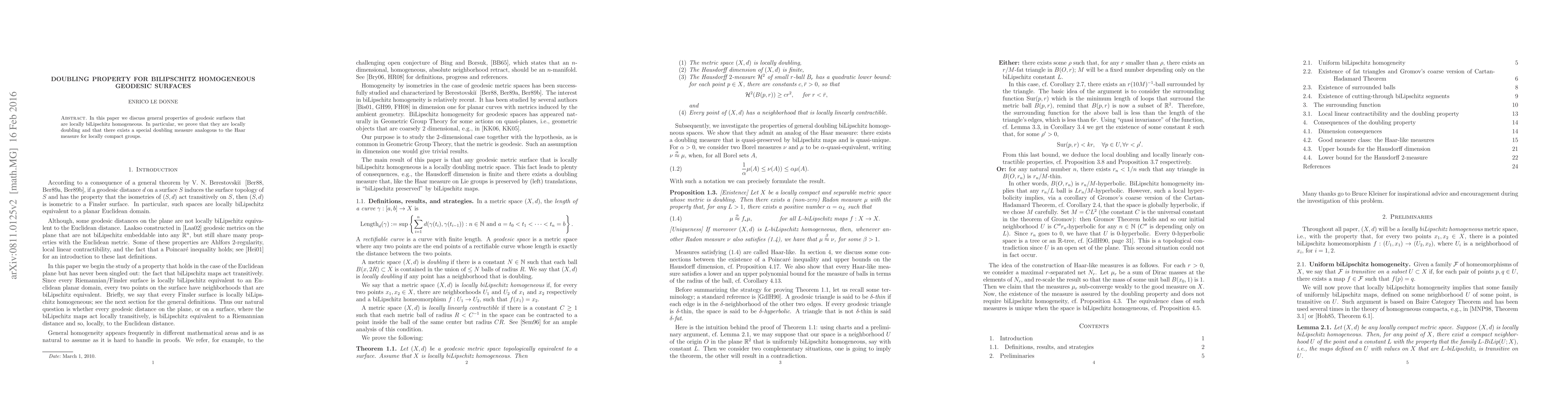 Locally biLipschitz homogeneous geodesic surfaces exhibit a doubling property, with a special measure analogous to the Haar measure for locally compact groups, providing insights into their geometric and topological structure.